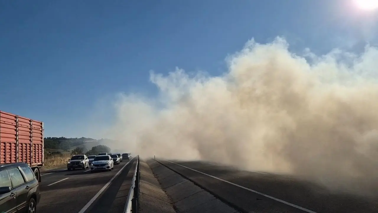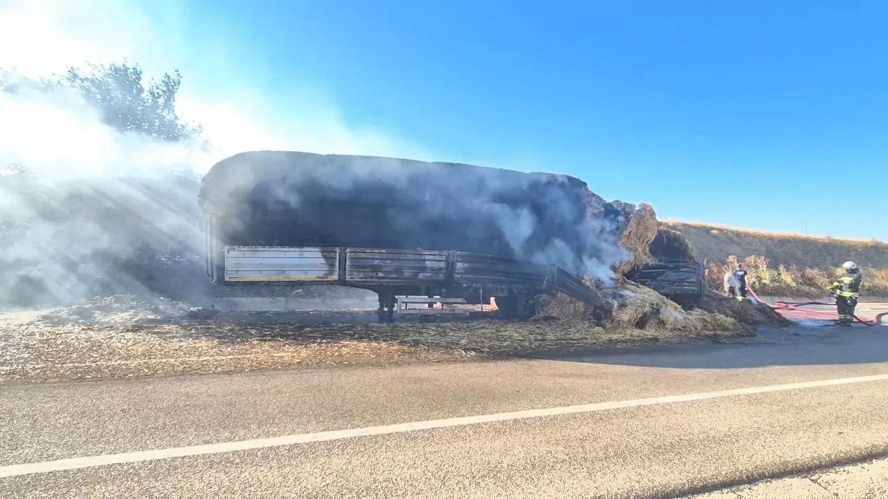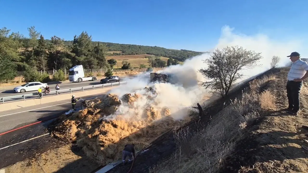 Yoğun duman, Tekirdağ-Malkara yolunda görüş mesafesini düşürdü. İtfaiye ekipleri tır dorsesi ve tarladaki yangını kontrol altına almak için mücadele etti.