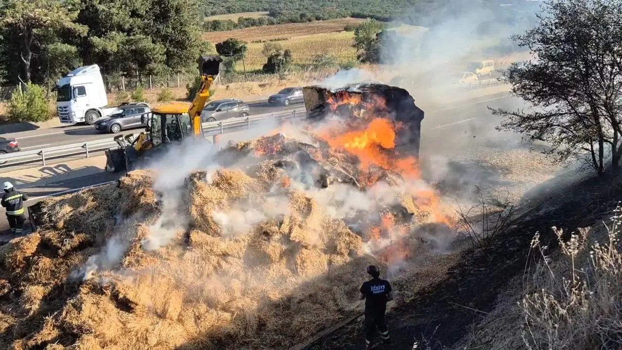 Tekirdağ'da LPG'li araç yangını buğday tarlasına ve seyir halindeki tırın dorsesindeki saman balyalarına sıçradı. Jandarma ve polis ekipleri yangın nedeniyle yolu trafiğe kapattı.