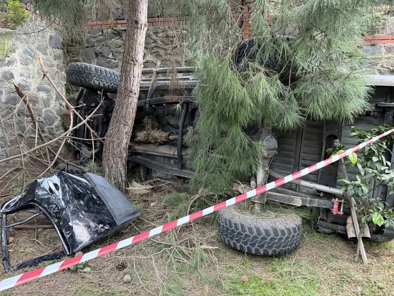 Trabzon'un Ortahisar ilçesinde bir kamyonet kontrolden çıkarak site bahçesine düştü, karı koca 2 kişi yaralandı.