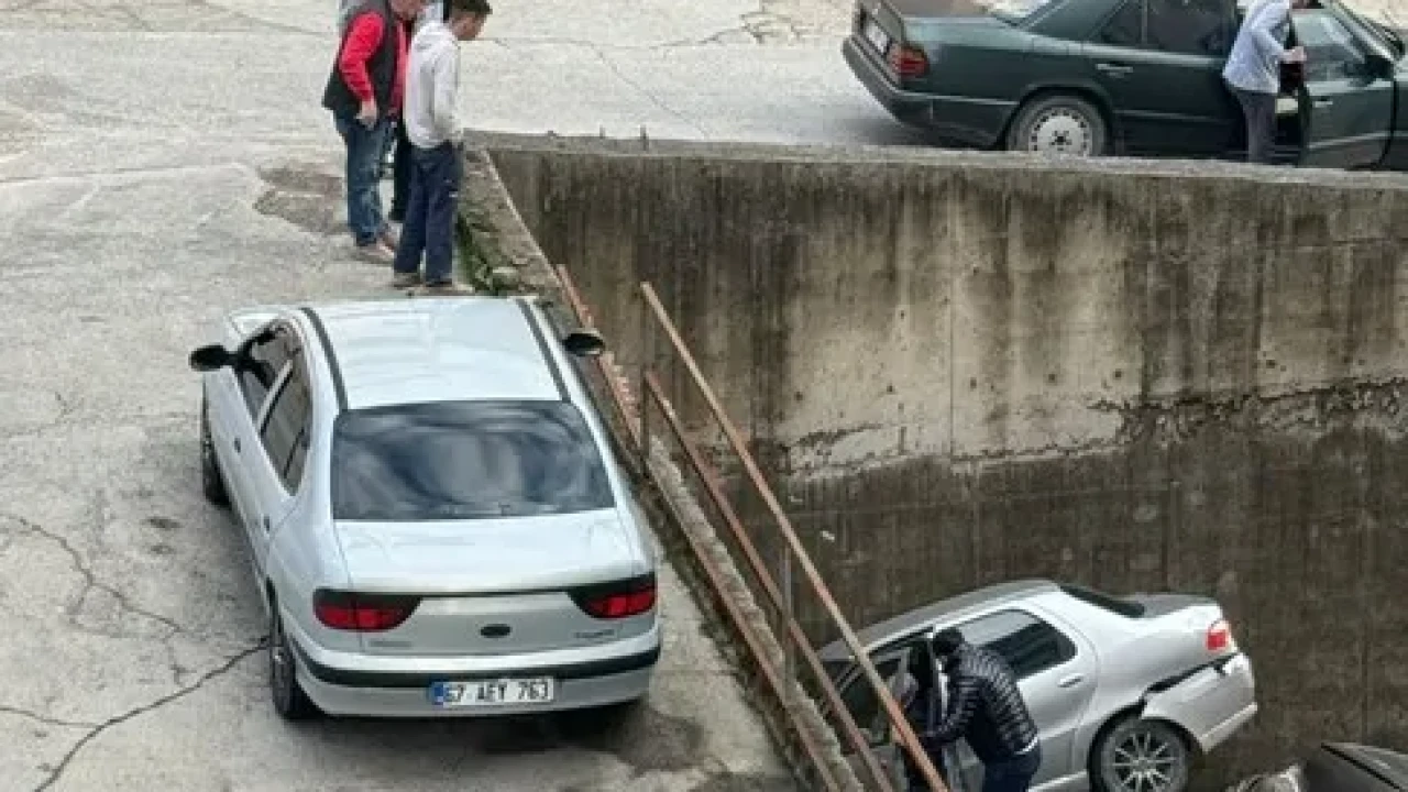 Zonguldak'ın Alaplı ilçesinde rampada geriye kayan otomobil 8 metreden düşerek park halindeki araca çarptı.