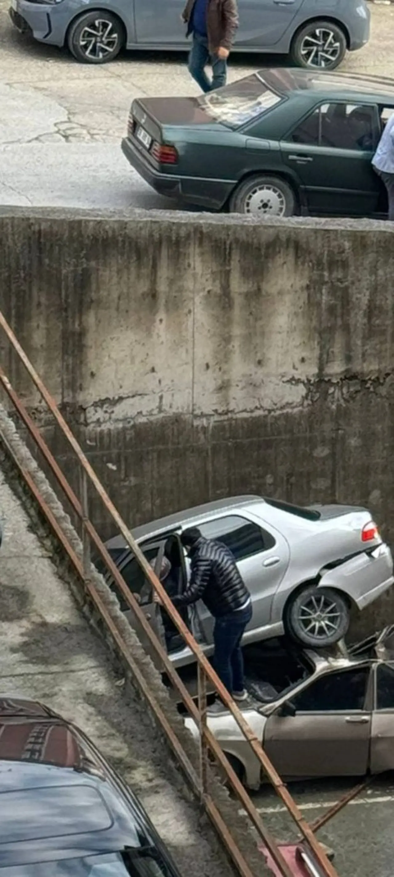 Karaağaç Mahallesi'nde meydana gelen kazada araç, rampayı çıkarken geriye kaydı. Yaklaşık 8 metrelik istinat duvarından düşen araç, park halindeki başka bir otomobilin üzerine çıktı.