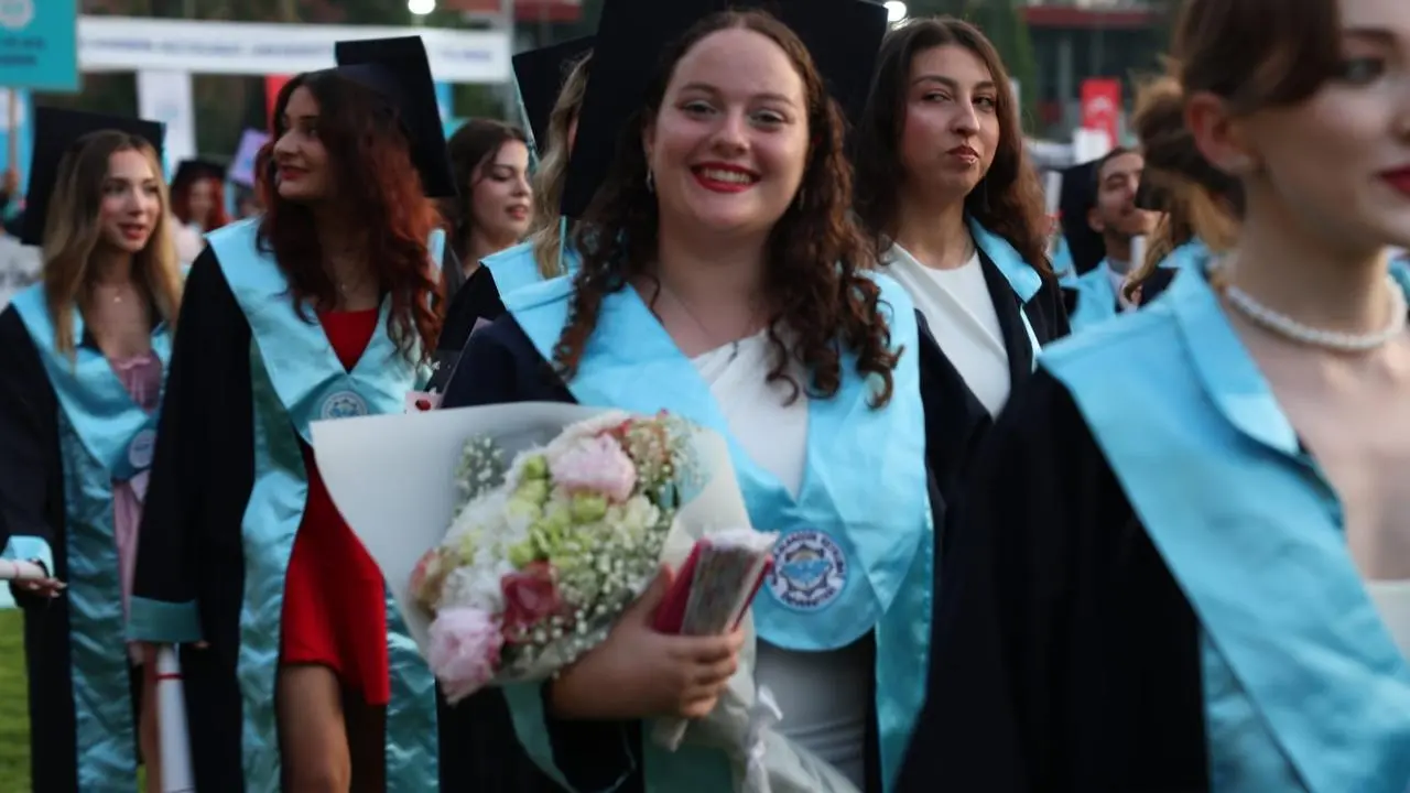 Mezuniyet töreni Atatürk Anıtı'na çelenk sunumuyla başladı. Ardından Konaklı Şehir Stadyumu'nda mezuniyet coşkusu devam etti.