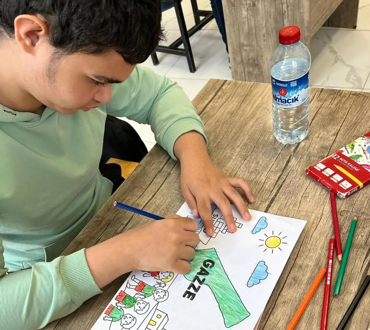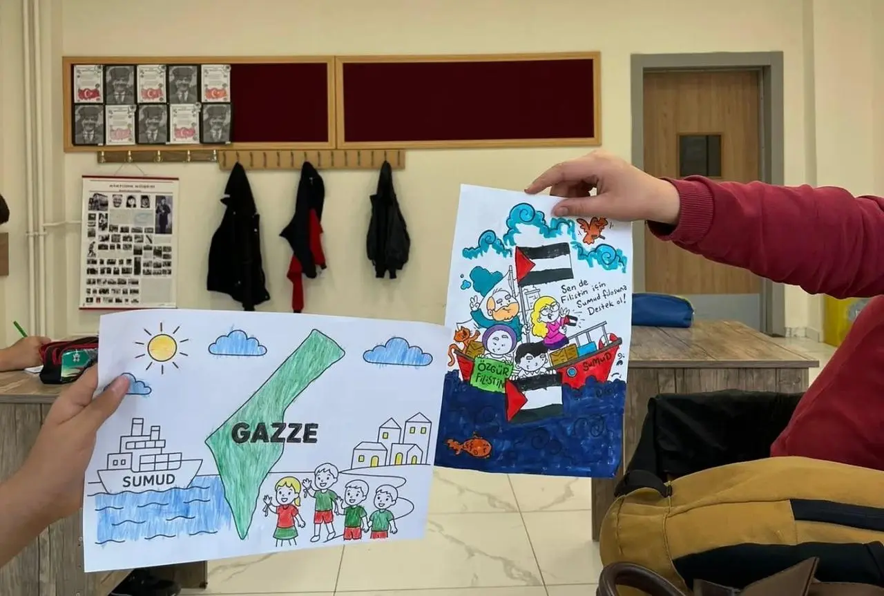 Öğrenciler, güvercinler ve Filistin bayrakları çizerek savaşın zararlarını anlattılar. Her bir resim, "Savaş kaybettirir, barış kazandırır!" mesajıyla insanlığa dokundu.
