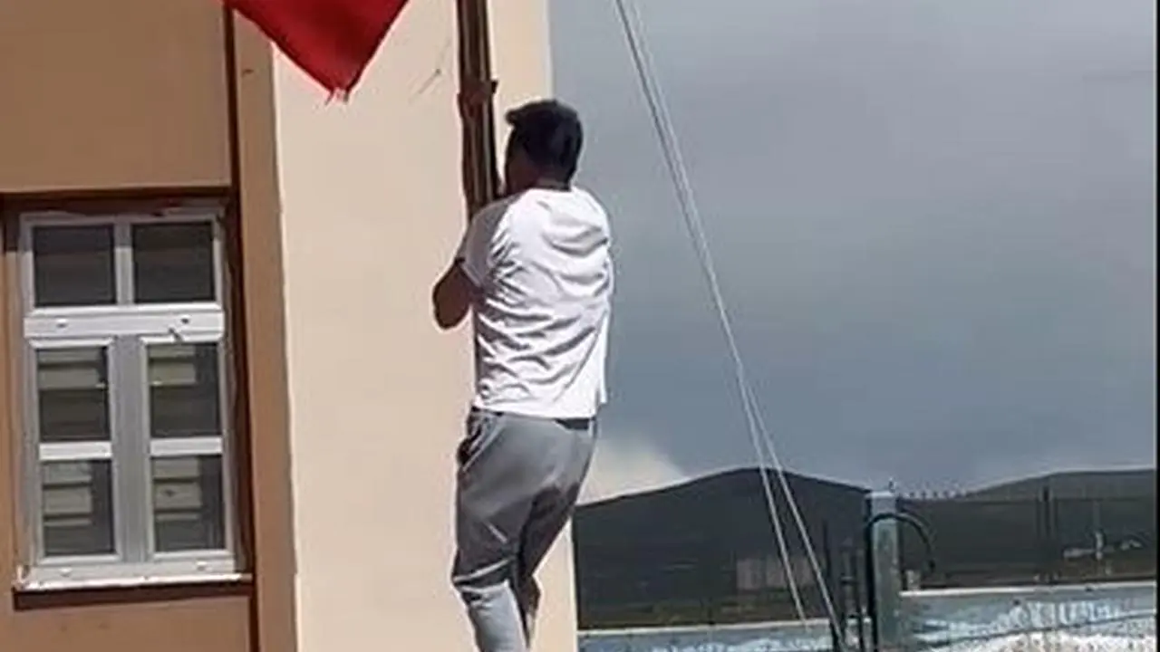 Ardahan'da bir okulun önünde direğe dolanan Türk bayrağını beden eğitimi öğretmeni tırmanarak çözdü ve alkış aldı.