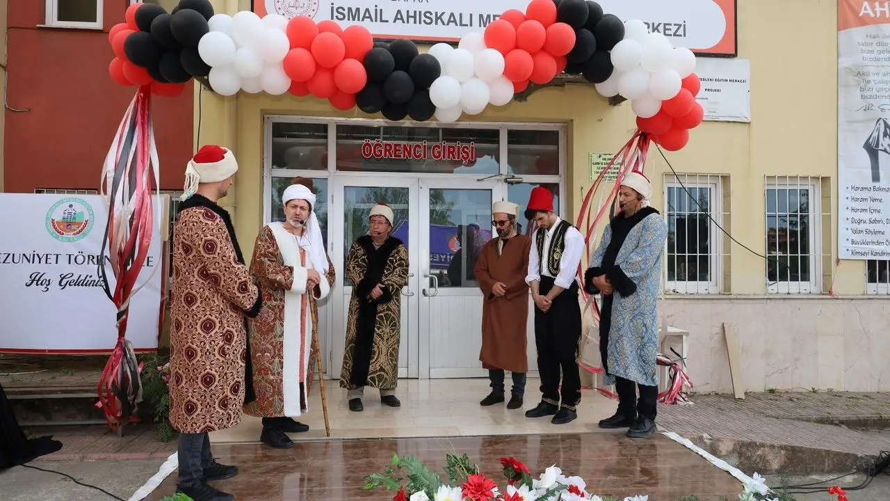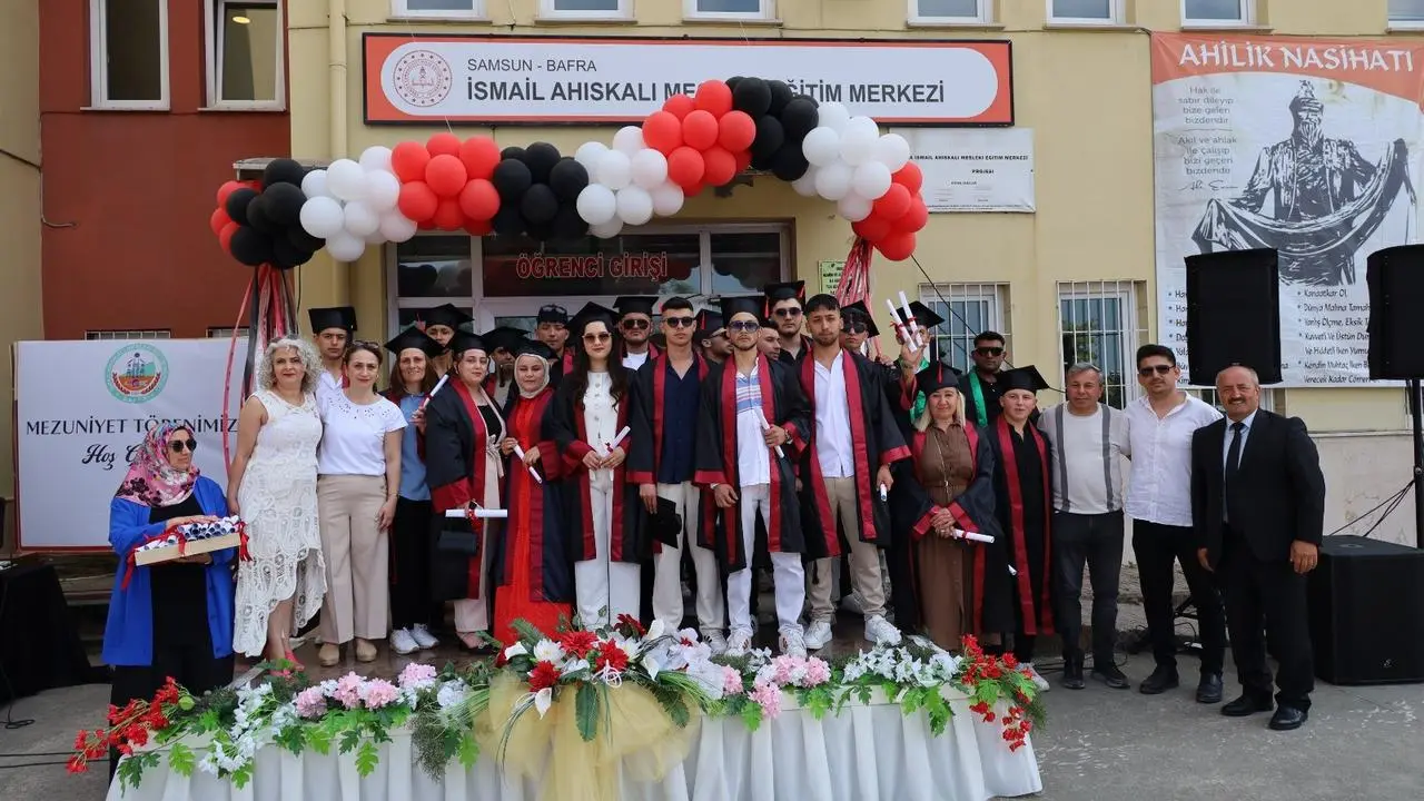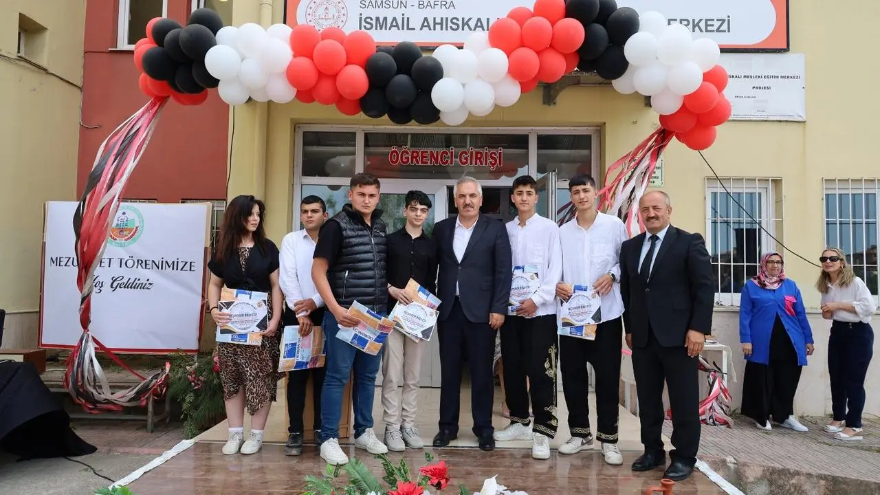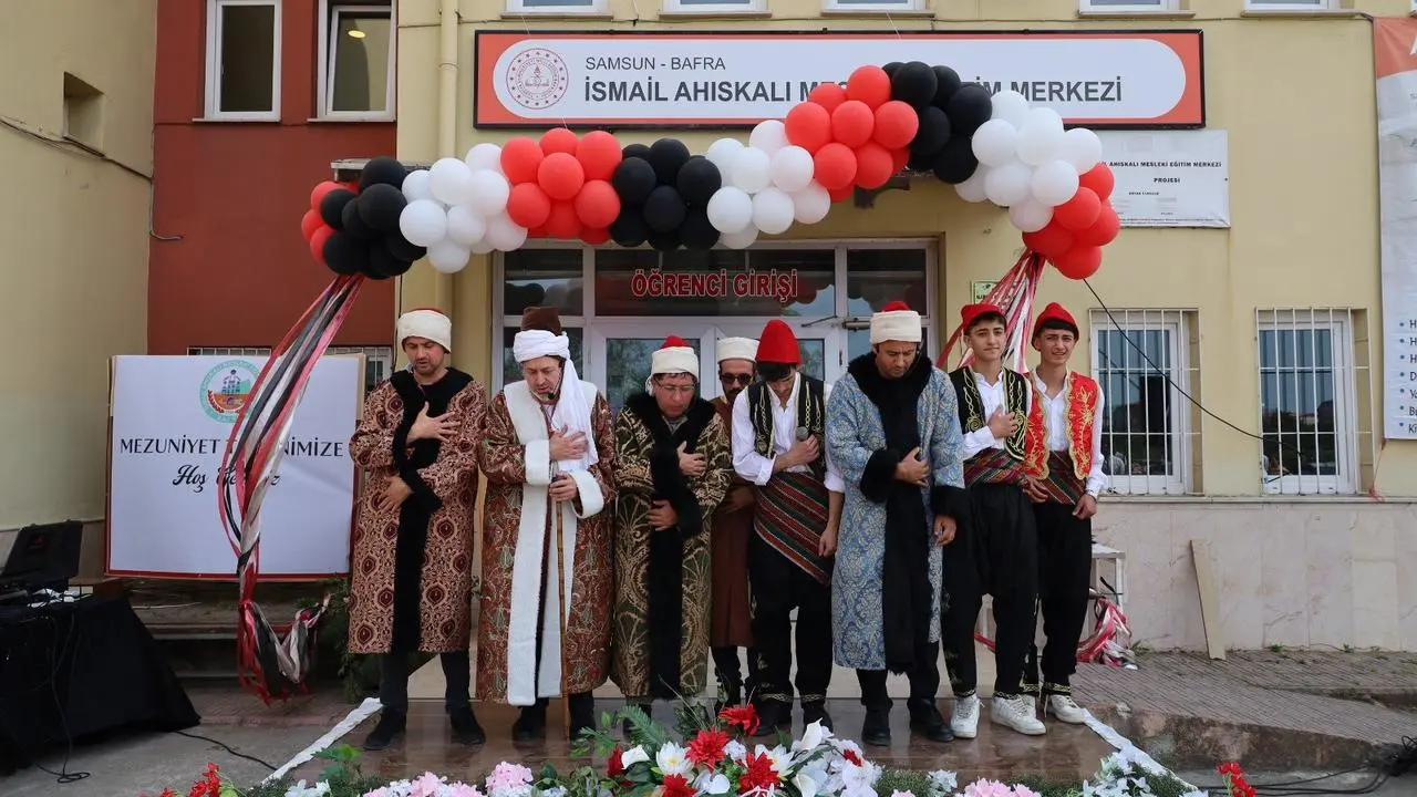 Samsun'un Bafra ilçesindeki İsmail Ahıskalı Mesleki Eğitim Merkezi'nde 145 öğrenci mezuniyet ve şed kuşanma töreniyle ahilik yolculuğuna başladı.