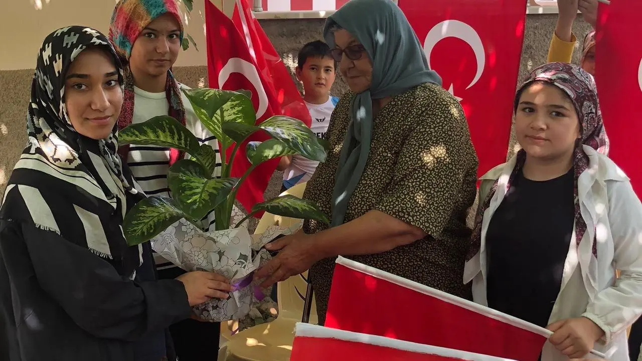 Öğrenciler, Kıbrıs Gazisi Hüseyin Gürbüzer'in eşi Hatice Gürbüzer'i evinde ziyaret ederek çiçek verdi. Bu ziyarette de Kur'an okuyup dua ederek manevi bir bağ kuruldu.