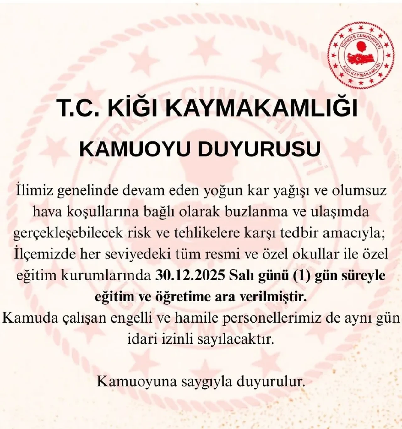 Adaklı, Karlıova ve Kiğı ilçelerindeki tüm resmi ve özel okullar tatil edildi. Kar yağışı ve buzlanma devam ediyor.