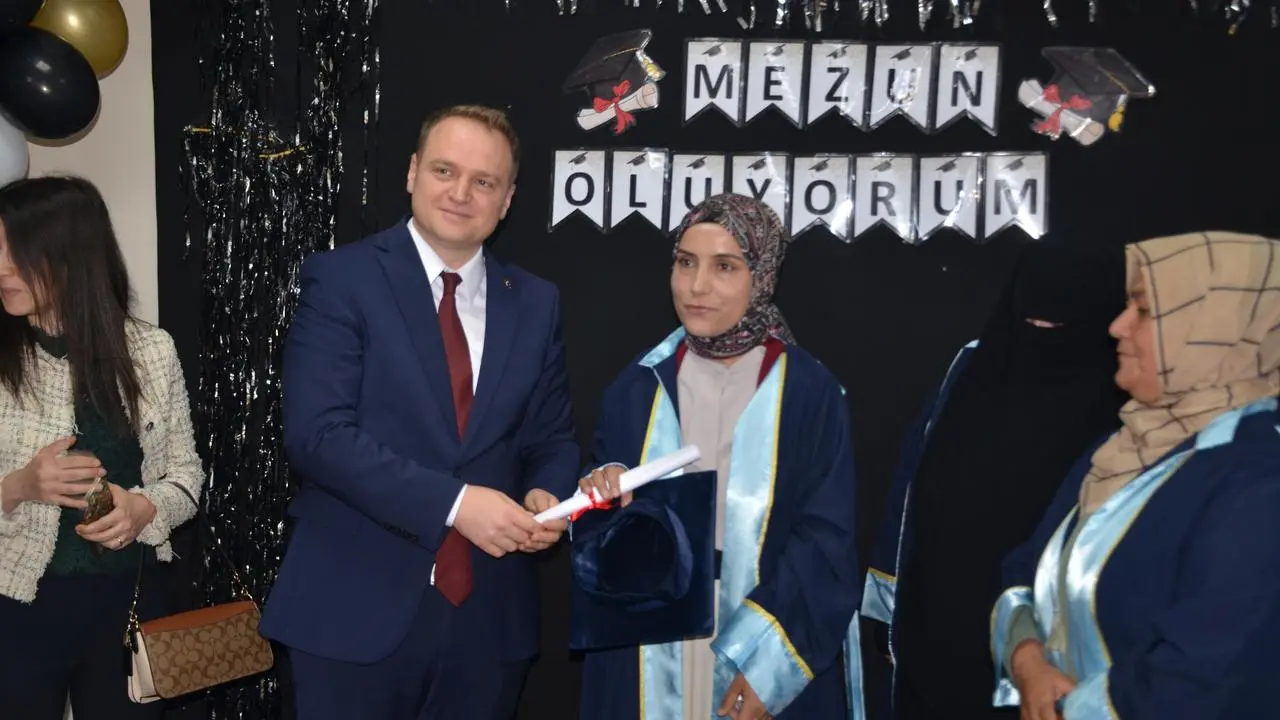 Kaymakam Ömer Övünç Koşansu ve eşi Yağmur Koşansu mezuniyet töreninde kursiyerlerle bir araya geldi. Kaymakam Koşansu, kadınların azim ve kararlılığından duydukları memnuniyeti dile getirdi.