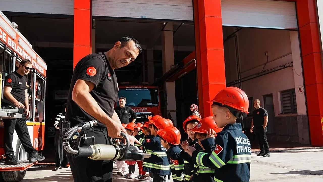 Minik misafirlere itfaiyeci kıyafetleri giydirilerek baret takıldı. Araçlara binen çocuklar eğlenceli anlar yaşadı.