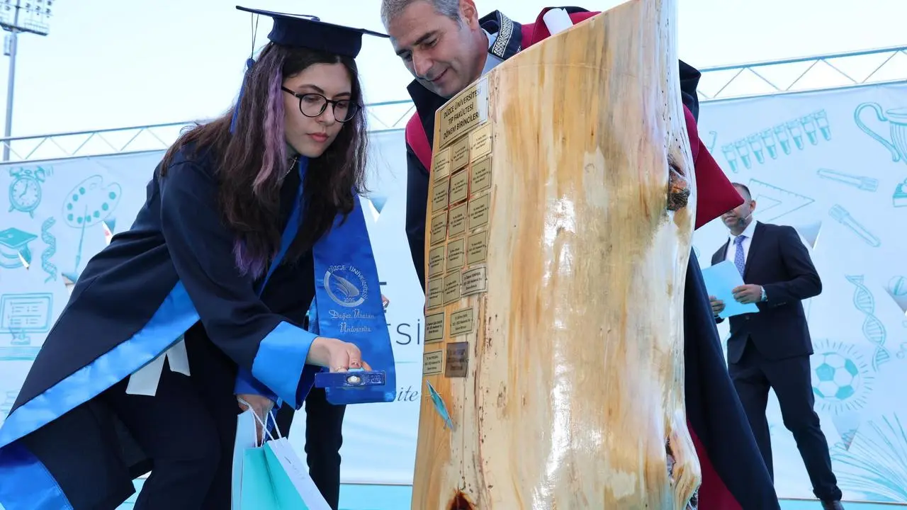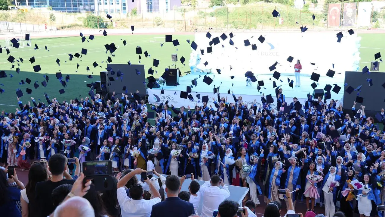 Düzce Üniversitesi'nin 2024-2025 akademik yılı mezuniyet töreninde dört fakültenin öğrencileri diplomalarını aldı ve keplerini fırlattı.