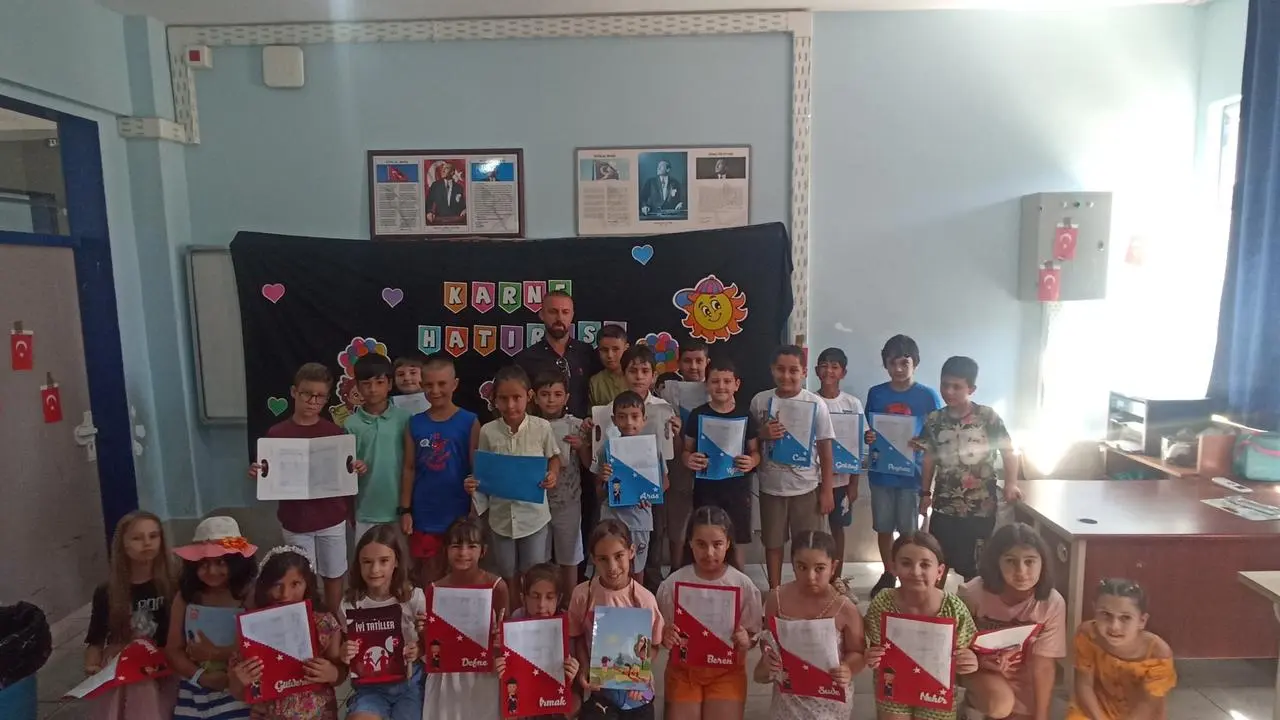 Protokol üyeleri sınıfları gezerek öğrencilere karnelerini teslim etti. Öğrenciler karneleriyle hatıra fotoğrafı çektirirken, veliler duygusal anlar yaşadı.