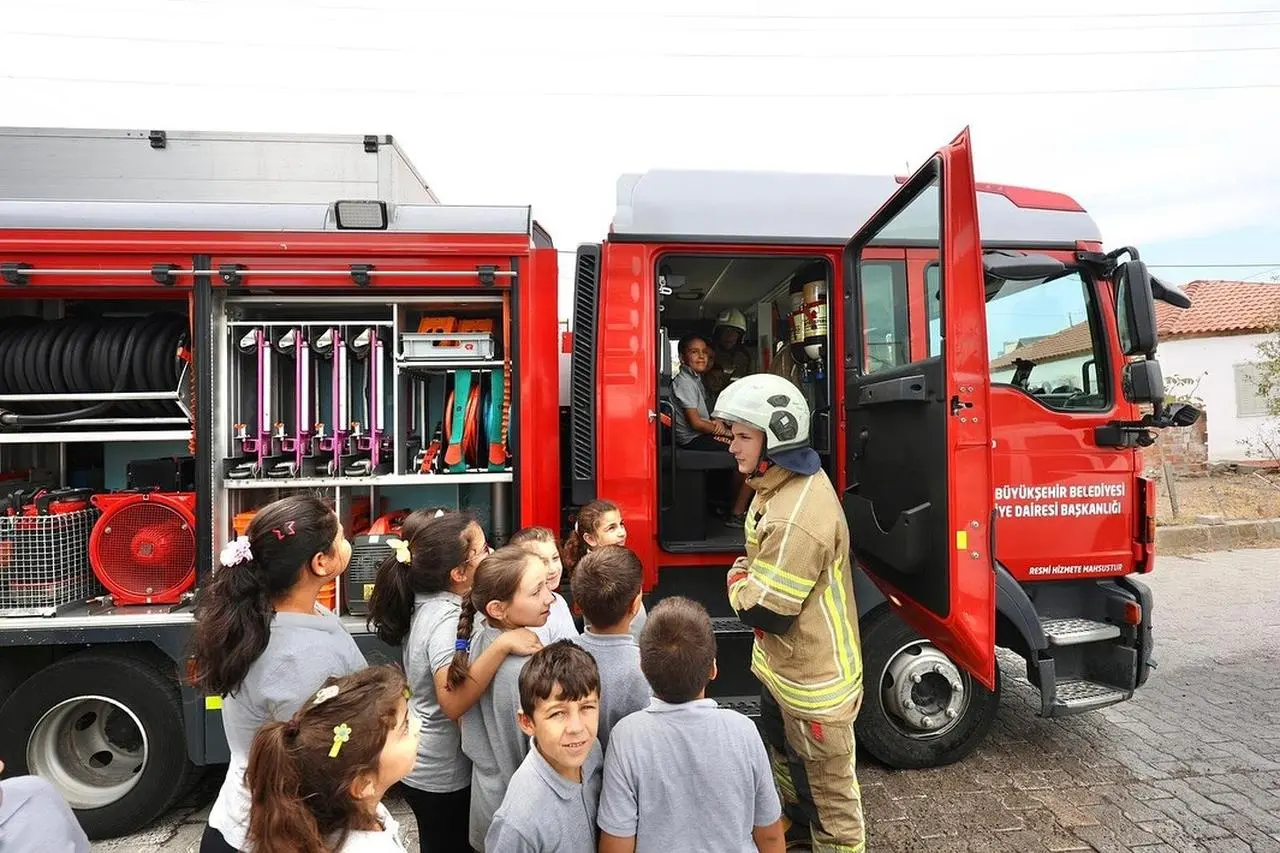 İtfaiye ekipleri, yangın söndürme araçlarını ve güvenlik önlemlerini öğrencilere detaylı şekilde anlattı. Öğrenciler, itfaiyecilerin giyimini uygulamalı olarak izledi.