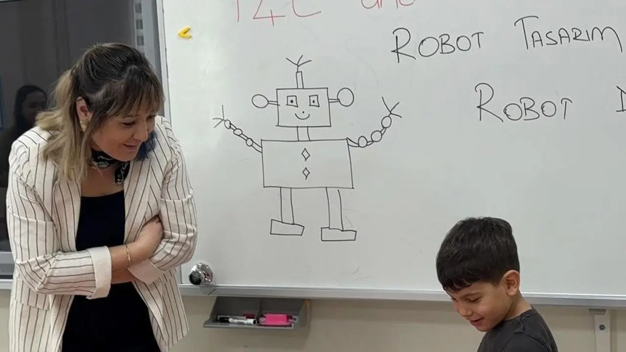 "Robot tasarlıyorum" temalı çalışmalar öğrencilerin yaratıcılığını ortaya çıkarıyor. Çocuklar, hayal güçlerini kullanarak robotların işlevleri üzerine düşüncelerini paylaşıyor.