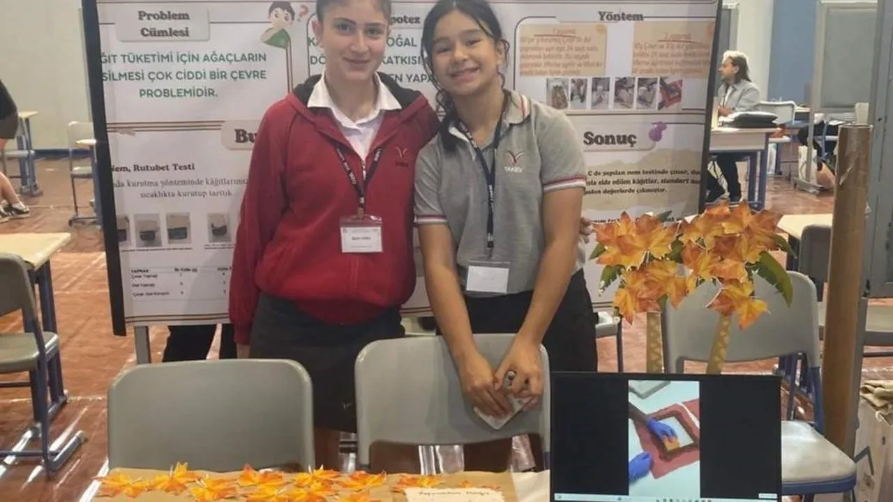 Öğrenciler sonbahar yapraklarının kağıt yapımına uygunluğunu araştıran projeleriyle dikkat çekti. Birincilik ödülü olarak 30 bin TL'lik ödülün sahibi oldular.