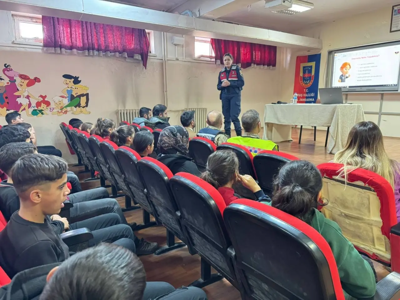 Muş İl Jandarma Komutanlığı ekipleri, Taşoluk İmam Hatip Ortaokulu öğrencilerine yönelik güvenlik eğitimi düzenledi. Kişisel güvenlik, suçtan korunma ve güvenli internet kullanımı konularında bilgilendirme yapıldı.