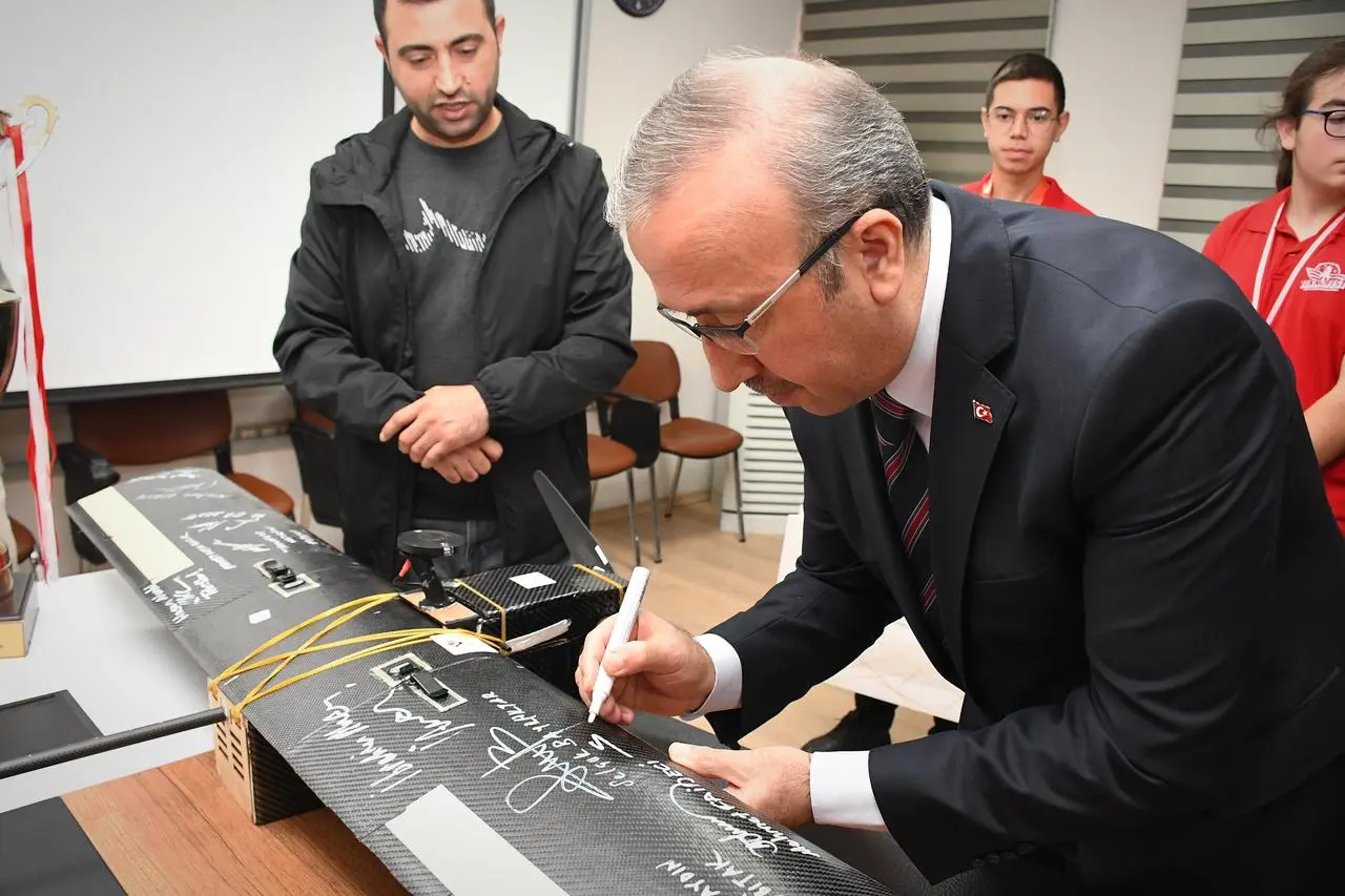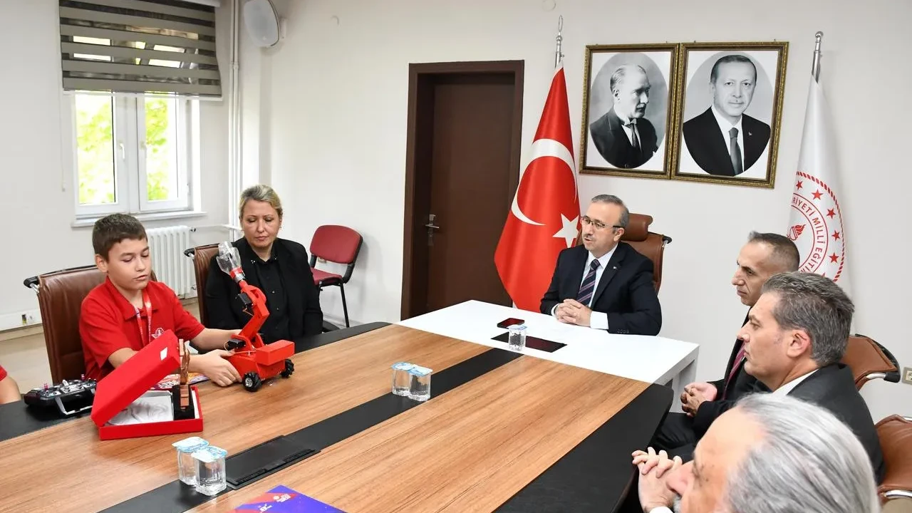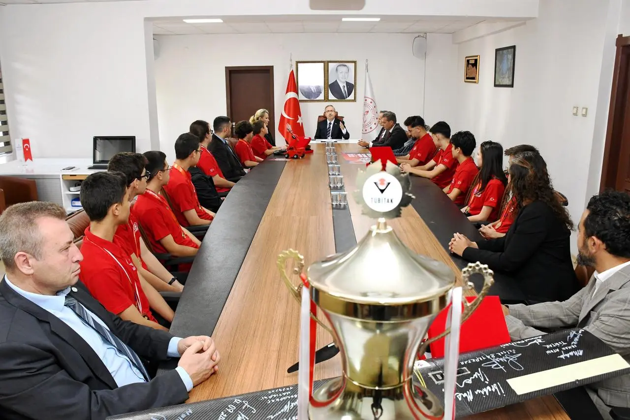 TEKNOFEST şampiyonlarından öğrenciler, Eskişehir İl Milli Eğitim Müdürü Sinan Aydın'ı ziyaret etti.