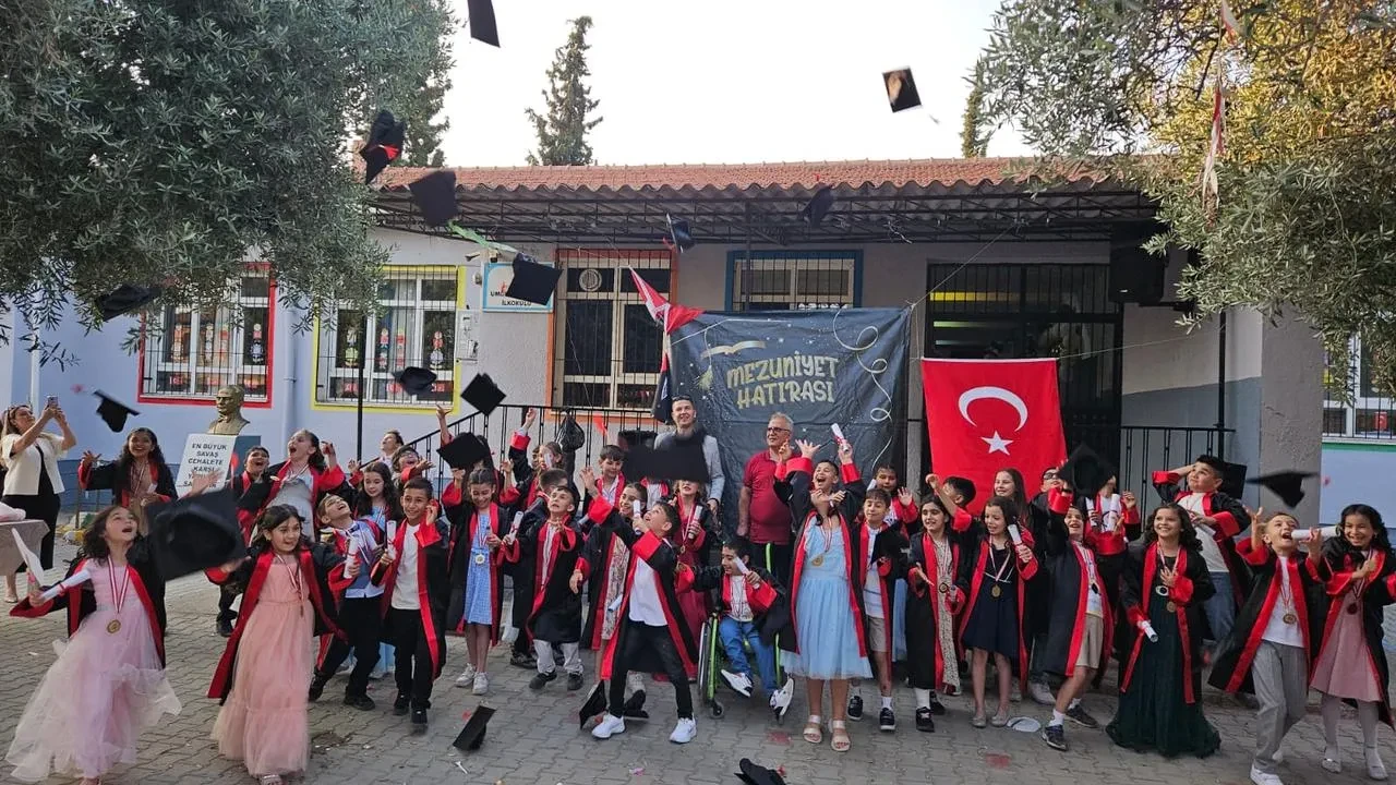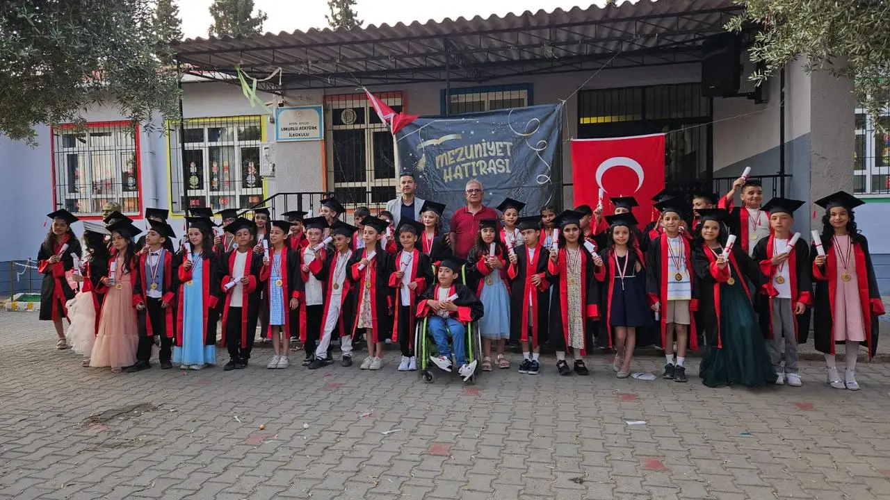 Aydın'ın Efeler ilçesindeki Umurlu Atatürk İlkokulu'nda 4-A sınıfı öğrencileri duygusal bir mezuniyet töreniyle okullarına veda etti.