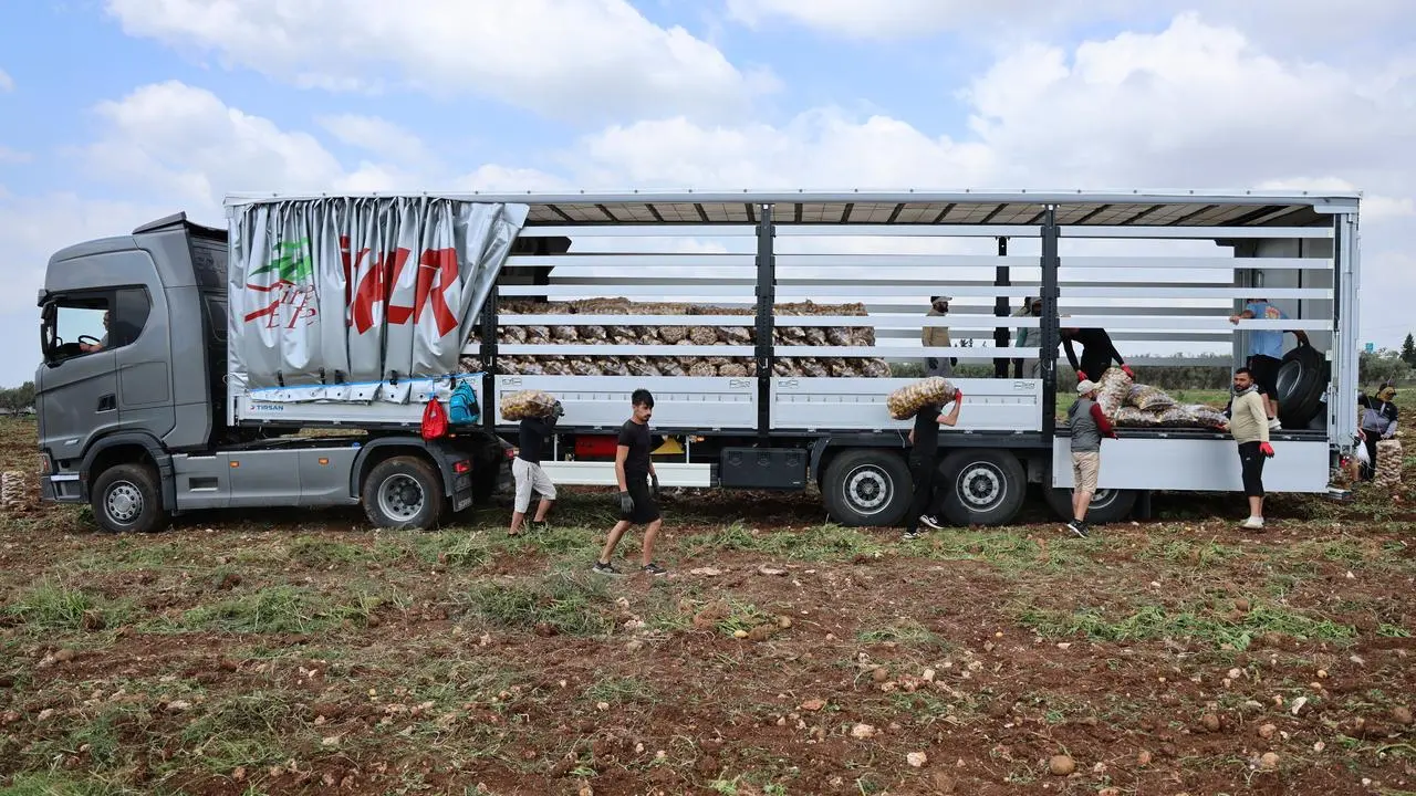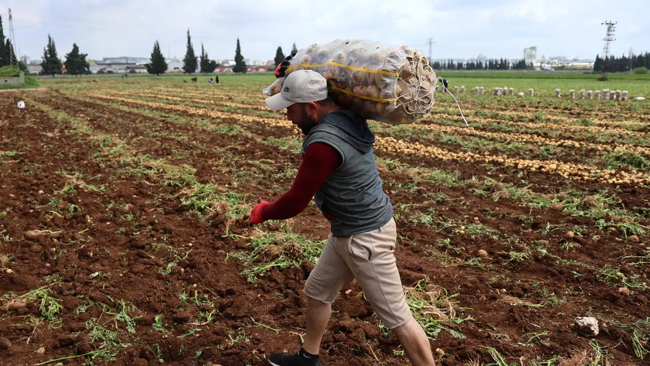 Adana'da erkenci patates hasadında çalışan özel yükleyici işçiler, günde 300 ton ürün taşıyarak 2500 TL kazanıyor.
