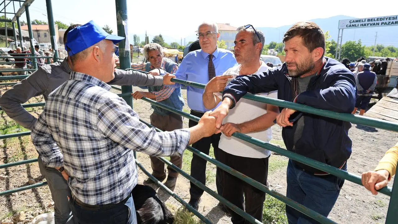 Çameli Belediye Başkanı Cengiz Arslan, Kurban Bayramı öncesi hayvan pazarını ziyaret ederek üreticilerle bir araya geldi.