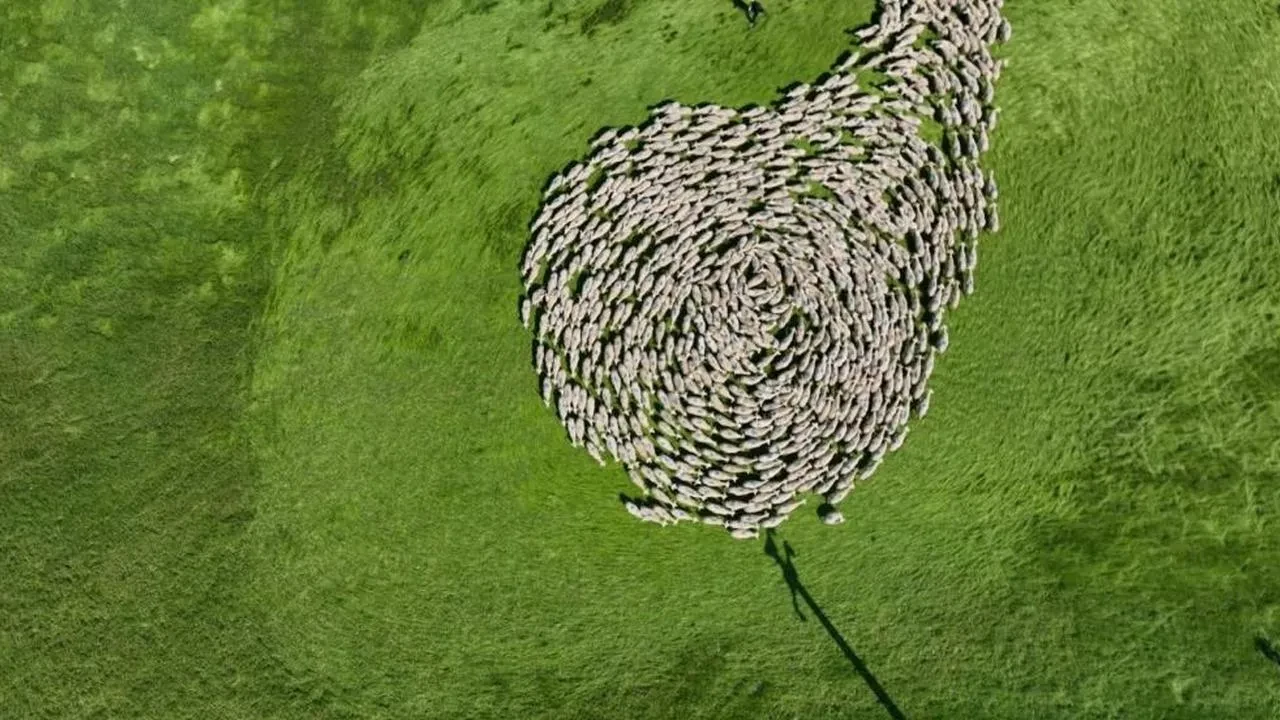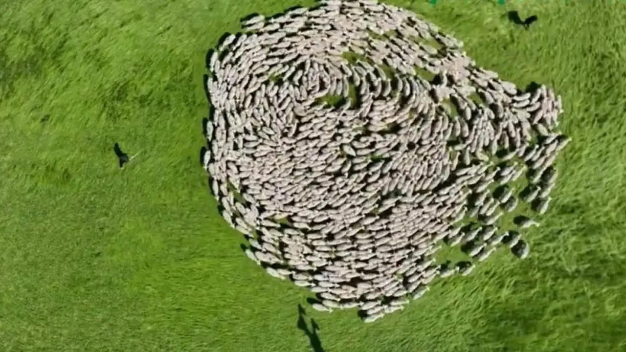 Bursa'nın Karacabey ilçesindeki Tarım İşletmeleri Genel Müdürlüğü'ne (TİGEM) ait 89 bin dekarlık arazide sıra dışı bir görsel şölen yaşandı. Binlerce koyunun çobanlar tarafından yönlendirilmesiyle oluşturulan "Dünya Dönüyor" koreografisi, drone ile gökyüzünden görüntülendi. Doğal yaşamın ritmiyle bütünleşen koyunların senkronize hareketi, izleyenleri büyüledi.