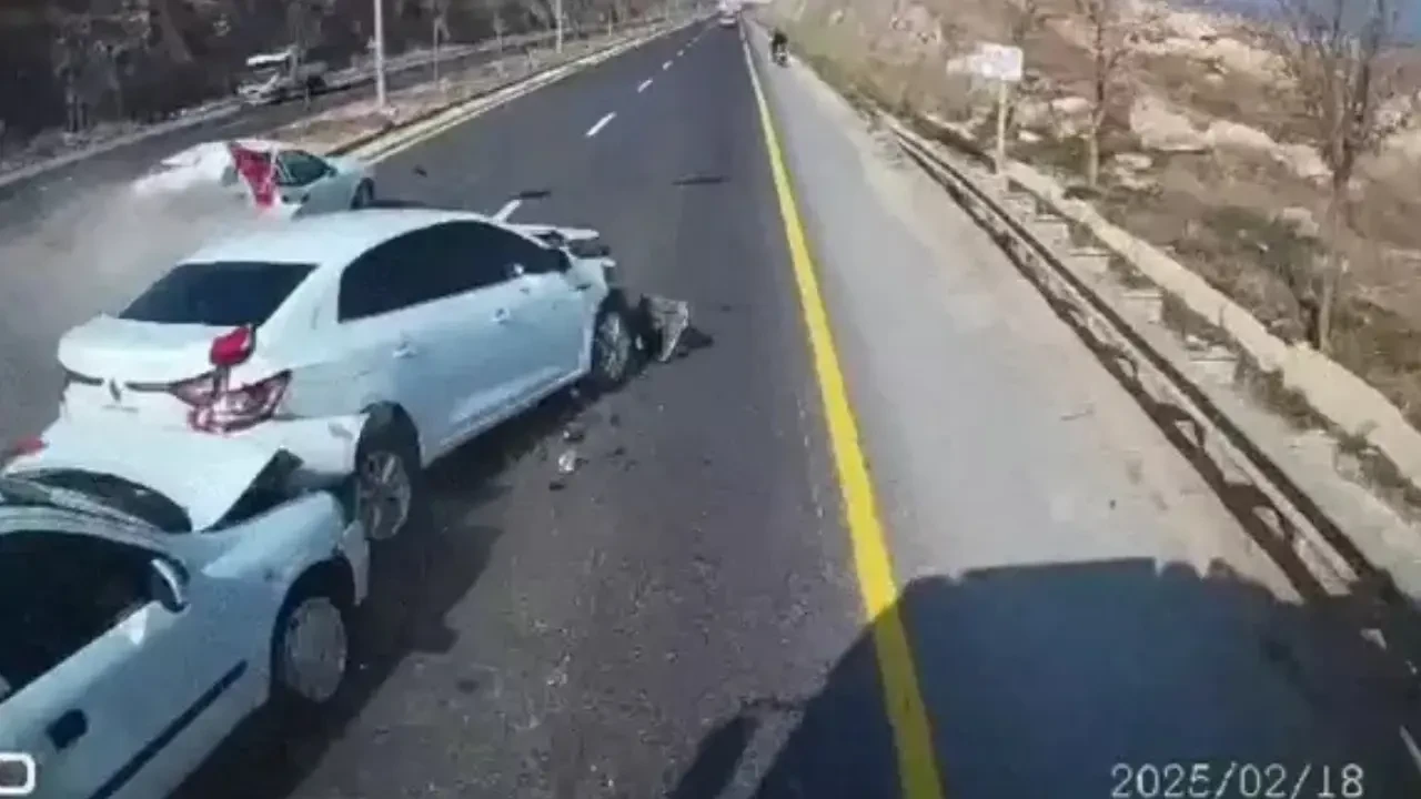Kaza anı, aynı istikamette hareket halinde olan bir kamyonun araç kamerasına yansıdı. Görüntülerde, yolun sağında ilerleyen kamyonun solundan hızla geçen otomobilin, sol şeritte bekleyen bir araca çarptığı anlar net bir şekilde görülüyor. Kazanın ardından meydana gelen çarpışmalar ve savrulmalar ise olayın boyutunu gözler önüne seriyor.