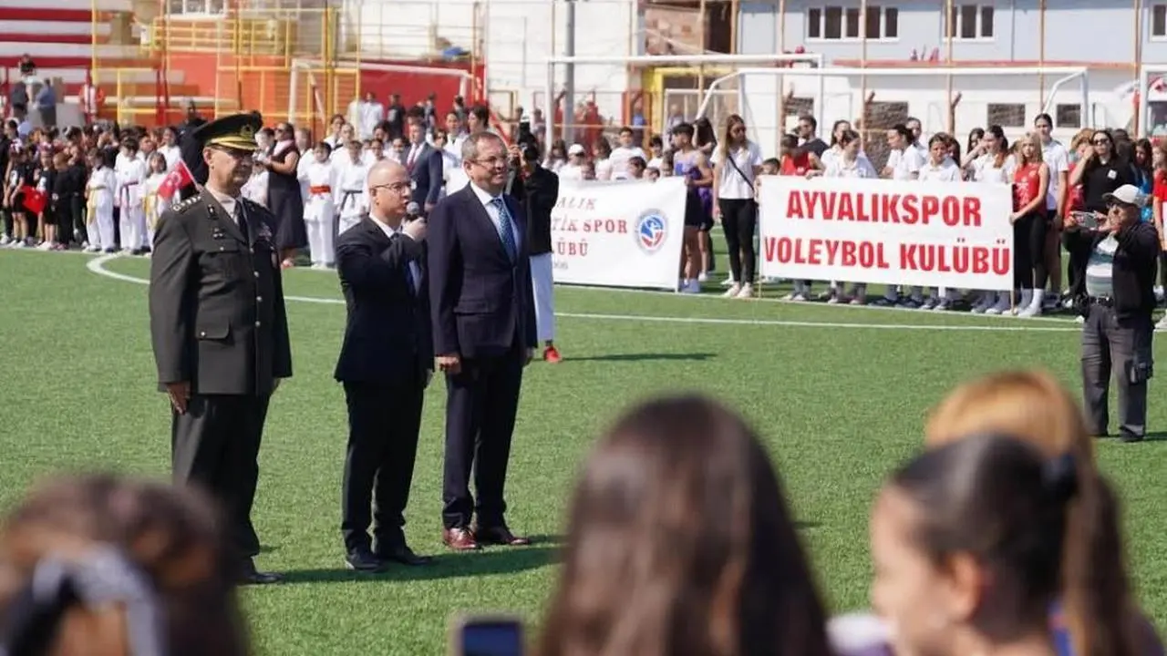 Kutlamaların başlangıcı, Cumhuriyet Meydanı'nda bulunan Atatürk Anıtı'na çelenk sunulmasıyla yapıldı. Ardından, Hüsnü Uğural Stadyumu'nda devam eden tören, saygı duruşu ve İstiklal Marşı'nın okunmasıyla başladı. Ayvalık Kaymakamı Hasan Yaman'ın öğrenci, öğretmen ve halkın bayramını kutlamasıyla coşku daha da arttı.