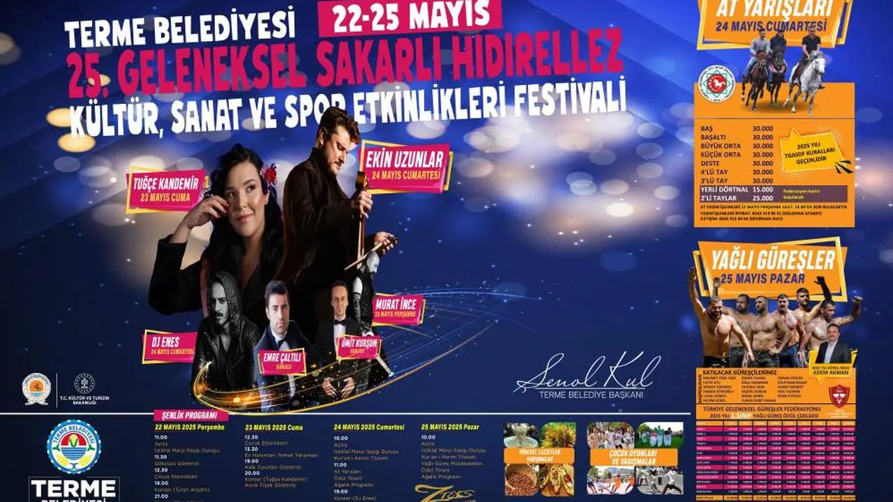 Terme Belediyesi, bu yıl 25. Geleneksel Sakarlı Hıdırellez Kültür Sanat ve Spor Festivali'ni düzenliyor. 22 Mayıs Perşembe günü başlayacak olan festival, ilk kez dört gün sürecek ve zengin programıyla ziyaretçilerine unutulmaz bir deneyim yaşatmayı hedefliyor. Festival boyunca kültür, sanat, spor ve eğlence dolu etkinlikler Terme halkını ve çevre illerden gelen misafirleri bekliyor.