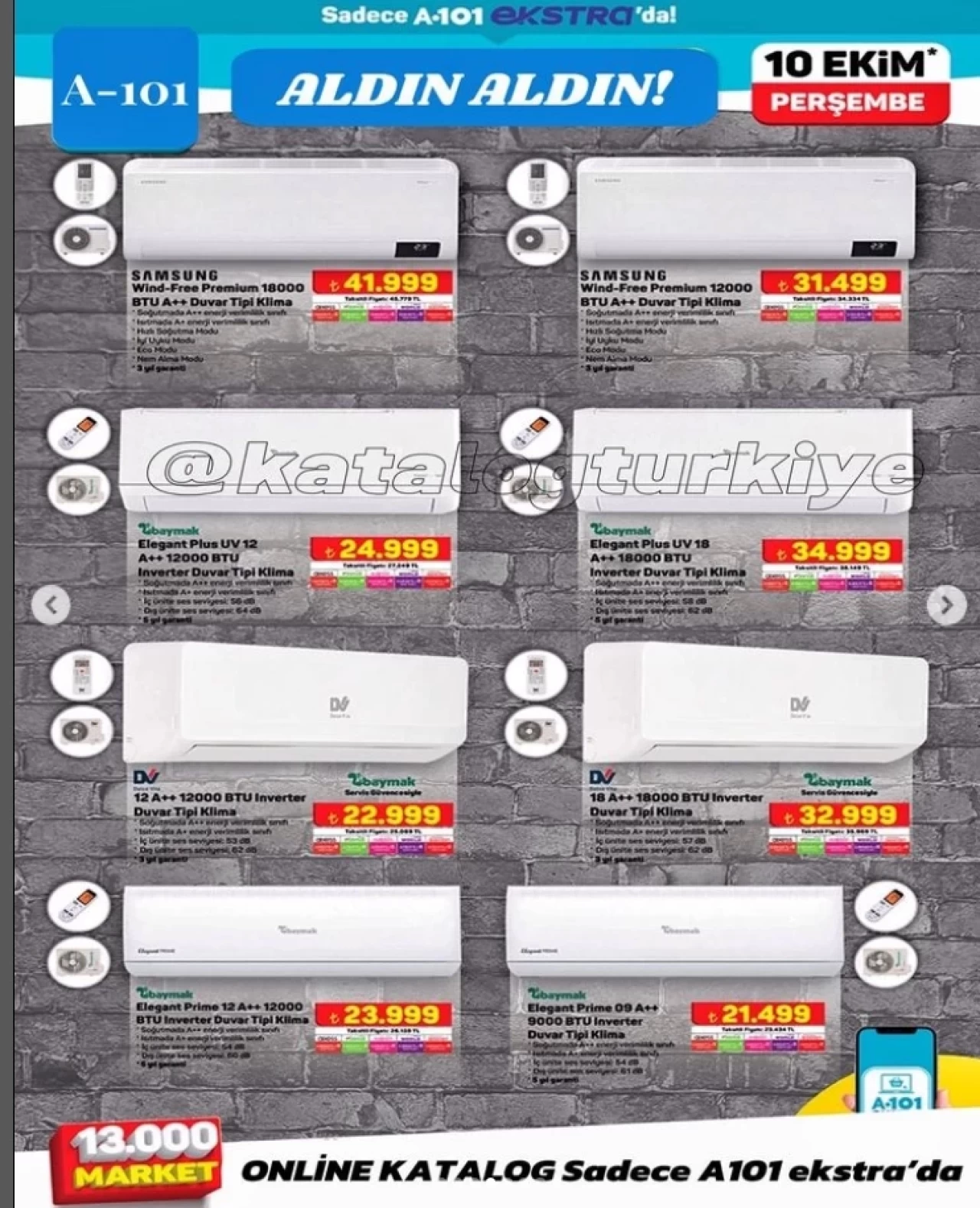 A101 zincir marketlerinin online kataloğunda en çok dikkat çeken ürün farklı markalara ait klima çeşitleri oldu. Samsung klima çeşitleri online mağazaya özel 31 bin 499 TL’den başlayan fiyatlar ilse satışa sunulurken Baymak klima çeşitleri farklı modelleri ile 21 bin TL’den başlayan fiyatlar ile satışta.