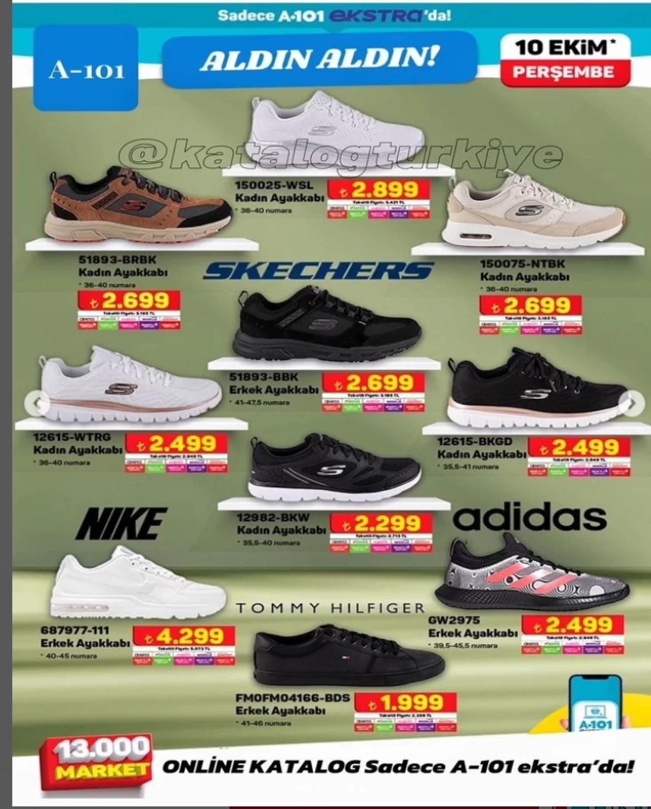 A101 marketleri yeni kataloğunda ünlü markaların ayakkabı, parfüm ve kol saatlerini de satışa sunuyor. Skechers, Nike, Adidas, Tommy Hılfıger markaların ayakkabıları 2 bin TL’den başlayan fiyatlar ile satışa sunulacak.
