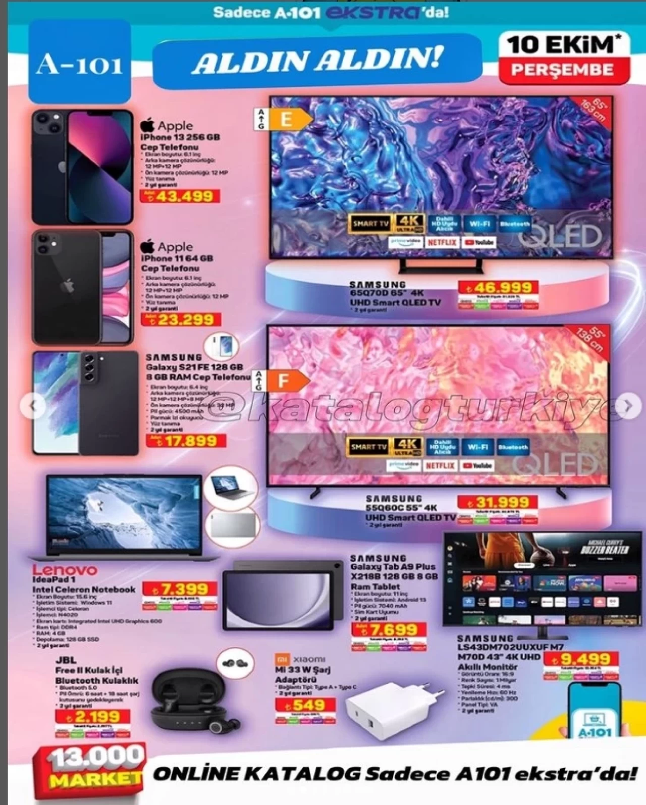 A101 marketlerinin online aktüel kataloğunda yok yok. Genellikle elektronik ürünler üzerine yoğunlaşan market zinciri Iphone 13, İphone 11, Televizyon çeşitleri, Samsung tablet gibi birçok ürünle indirimlerini başlattı.