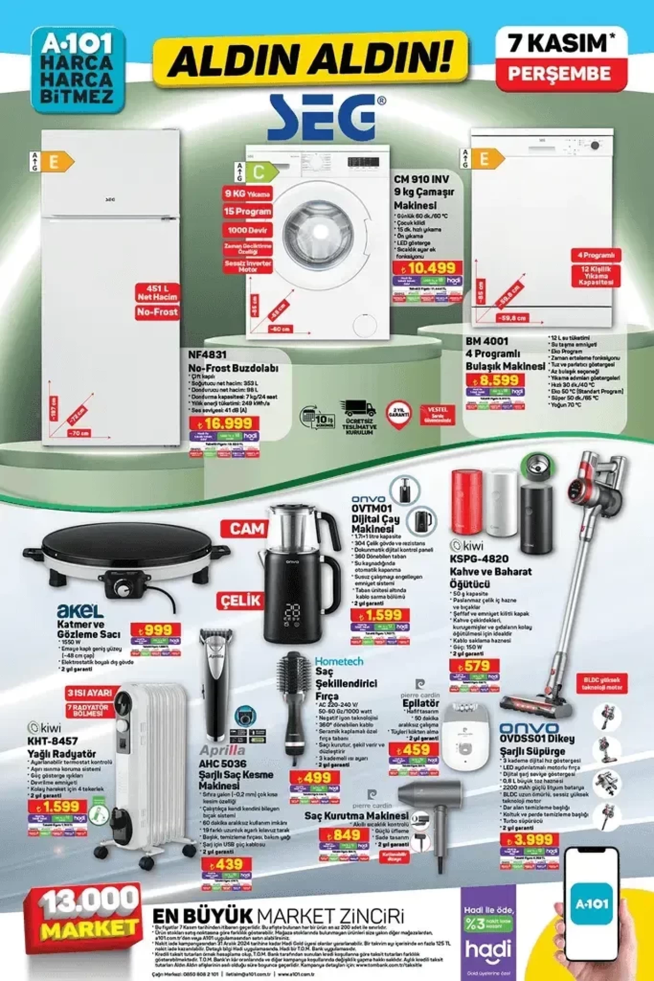 A101, bu hafta müşterilerine birbirinden ilginç ürünler sunuyor. Kataloğun dikkat çekici ürünleri arasında motorlu araçlar, elektronik aletler ve beyaz eşya çeşitleri yer alıyor. İşte A101 Aldın Aldın 7 Kasım aktüel ürünleri: