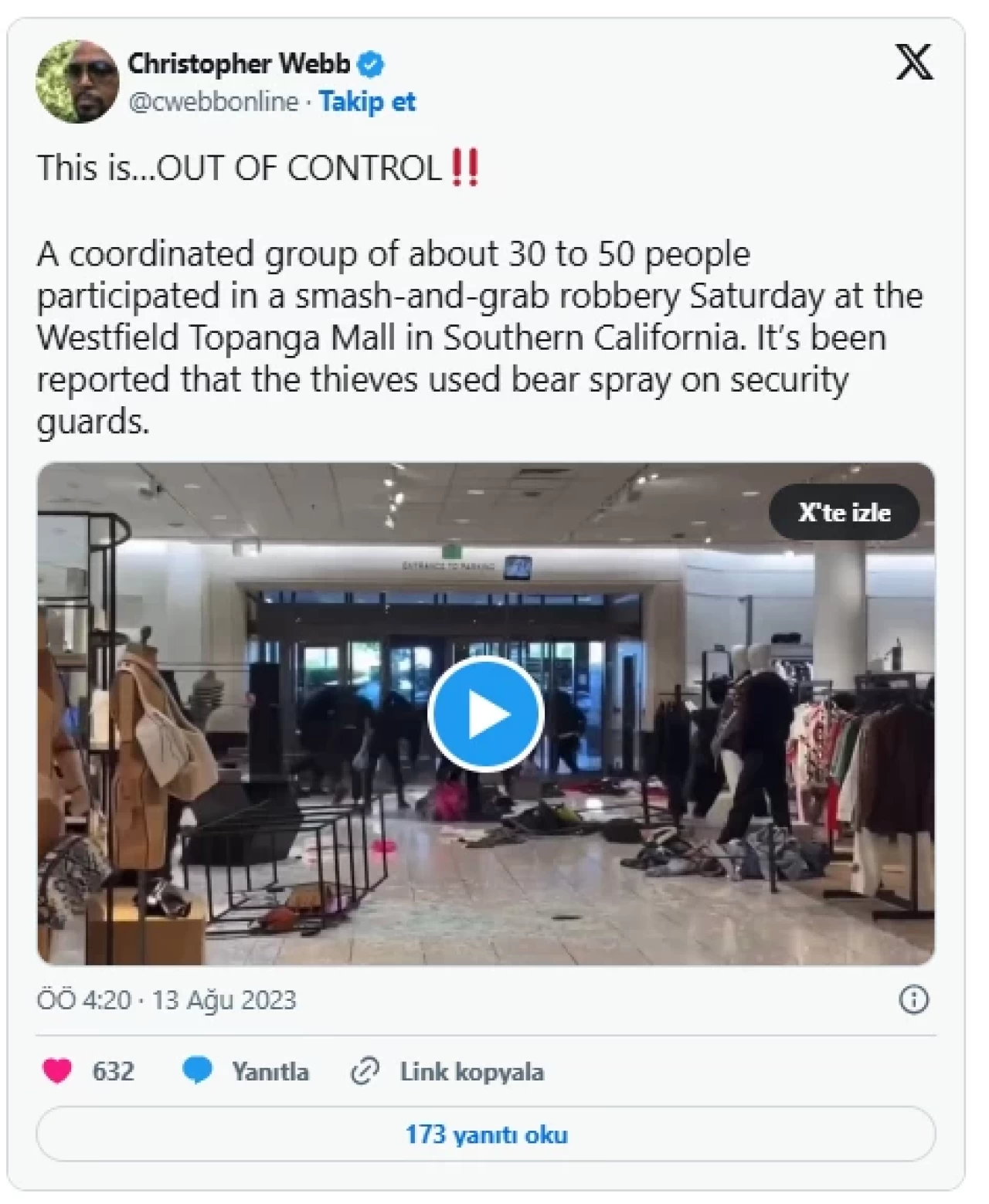 Yaklaşık 50 kişilik bir grup, Woodland Hills'teki Westfield Topanga Alışveriş Merkezi'ne düzenlediği baskında, güvenlik görevlilerine ayı kovucu spreyle saldırdı. Olayın ardından, lüks el çantaları ve giysilerle birlikte hızla mağazadan kaçtılar. Polis, "çok sayıda kişinin hırsızlık yaptığı" ihbarı üzerine harekete geçerek bölgeye intikal etti.