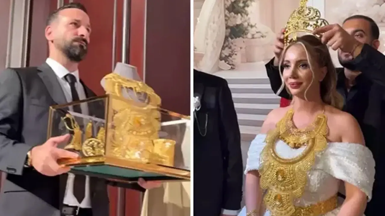 Damadın düğüne üzerinde milyon dolar değerindeki altınlarla dolu bir cam fanusla gelmesi ise adeta geceye damga vurdu. Bu gösterişli detay, sosyal medya kullanıcıları tarafından büyük ilgi gördü. Görüntüler binlerce kez paylaşılarak kısa sürede gündem oldu.