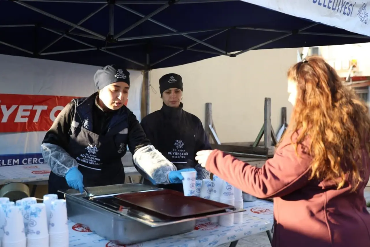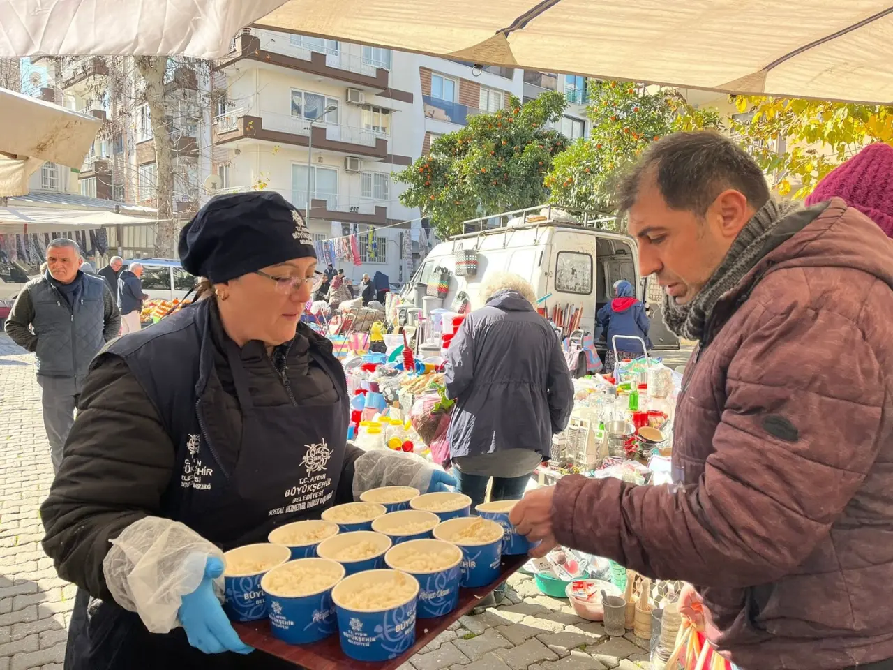 Aydın Büyükşehir Belediyesi, soğuk kış günlerinde pazarcı esnafı ve vatandaşlara sıcak çorba ile tavuklu pilav ikram etti.