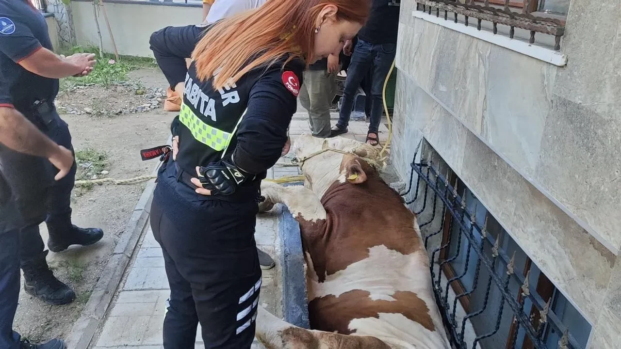 Kocasinan Mahallesi'nde sahibinin kontrolünden kurtulan boğa, apartmanın giriş katında mahsur kaldı. Kurbanlık hayvan, pencere ile kaldırım arasındaki boşluğa sıkıştı.