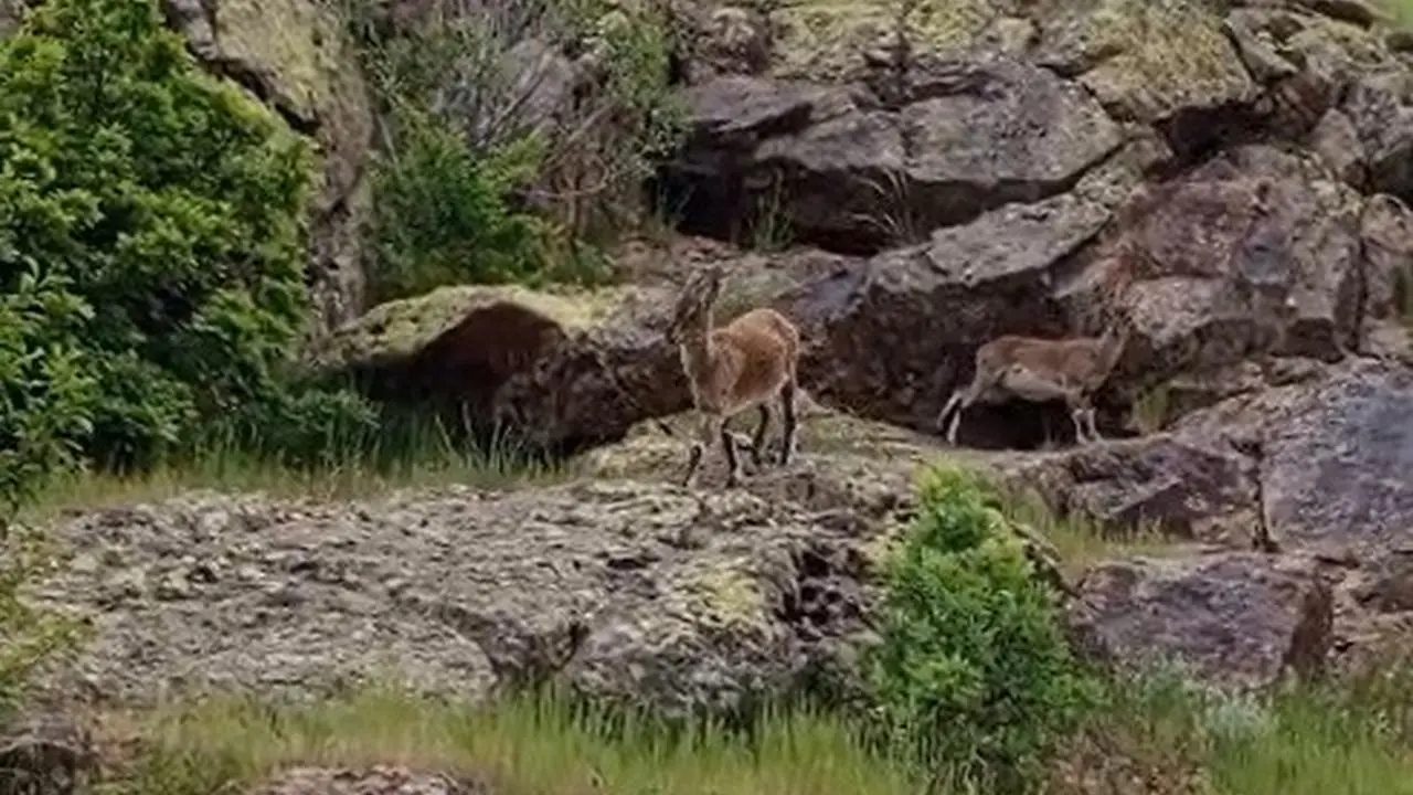 İhsan Karaaslan, Üzengili köyüne giderken yol kenarında iki dağ keçisiyle karşılaştı. Keçilerin usta tırmanışını gören vatandaş, hemen telefonuna sarılarak görüntülemeye başladı.