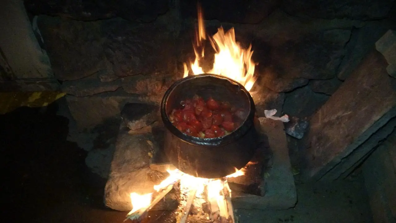 Ev kadınları, tarladan topladıkları domatesleri odun ateşinde pişirip salça haline getiriyor.