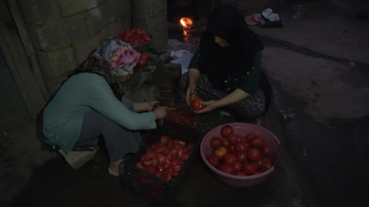 Sabah erken saatlerde bir araya gelen kadınlar, domatesleri kabuklarından ayırıyor ve pişiriyor.