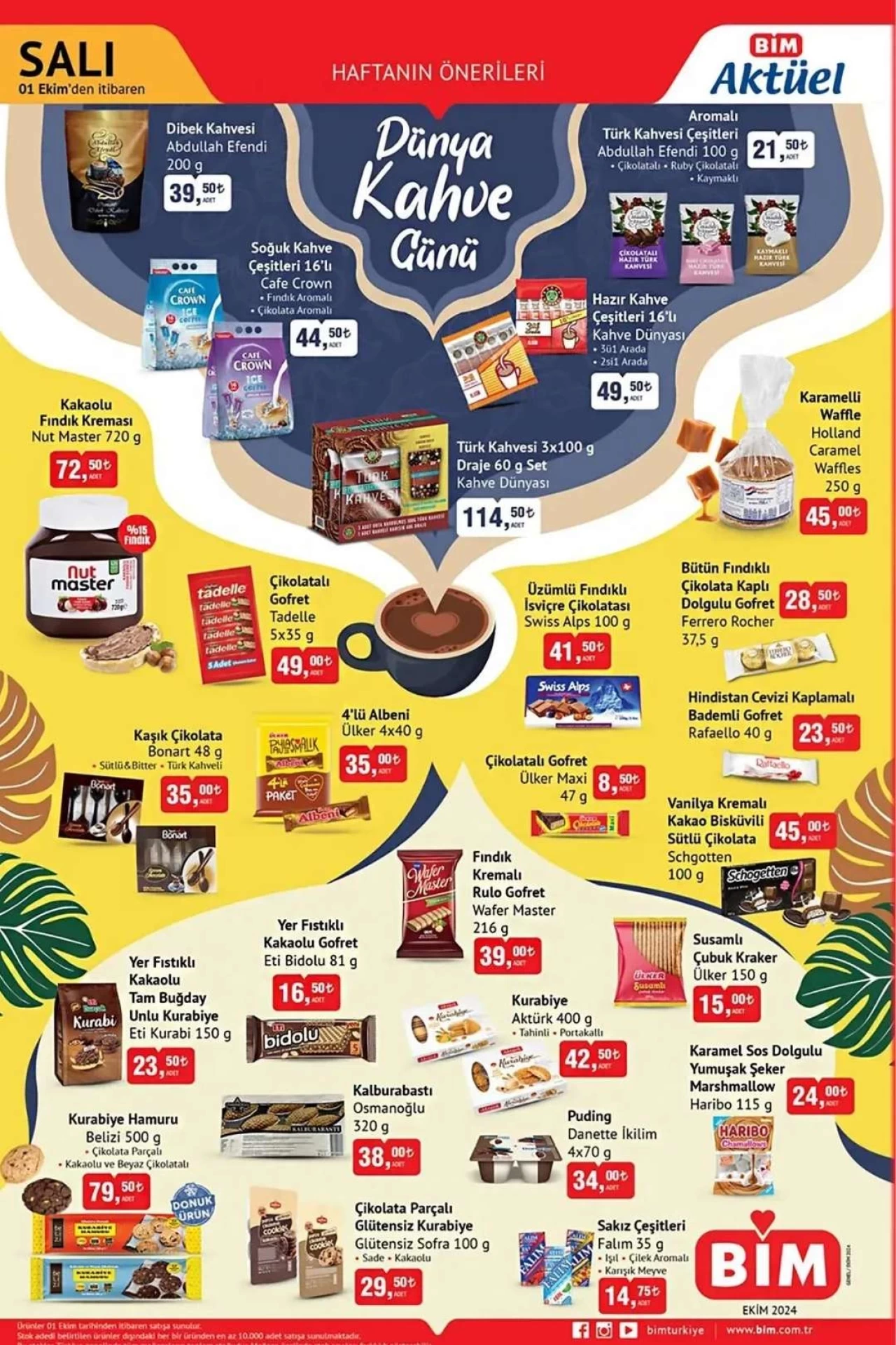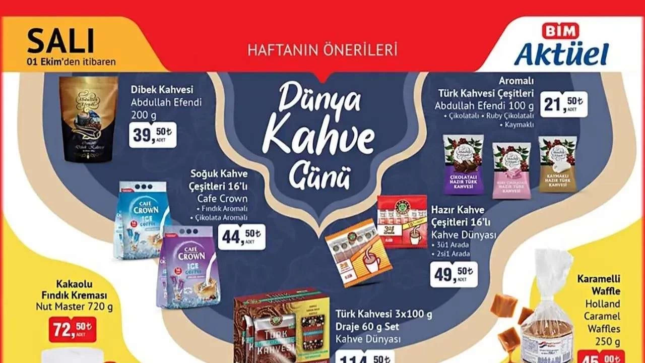 Bu hafta, BİM 1 Ekim 2024 kataloğunda "Dünya Kahve Günü" temalı bir sayfa yer alıyor. Bu sayfada, kahveler ve çeşitli atıştırmalıklar bulunuyor. Peki, hangi kahveler Bim'e geliyor? Dibek kahvesi, soğuk kahve çeşitleri, Türk kahvesi, hazır kahve çeşitleri ve aromalı Türk kahvesi (çikolatalı, Ruby çikolatalı, kaymaklı) 1 Ekim itibarıyla raflarda olacak. Kahvenin yanında ise kaşık çikolata, Ülker çikolatalı gofret, çeşitli bitter ve sütlü çikolatalar, karamelli waffle ve Nut Master kakaolu fındık kreması gibi lezzetler de sizleri bekliyor. Ayrıca, bisküviler, kurabiye ve tatlılar gibi diğer atıştırmalık ürünler de indirimde. Bu grupta unlu kurabiye, rulo gofret, Aktürk kurabiye, kalburabastı, çubuk kraker ve yumuşak şekerler yer alıyor.