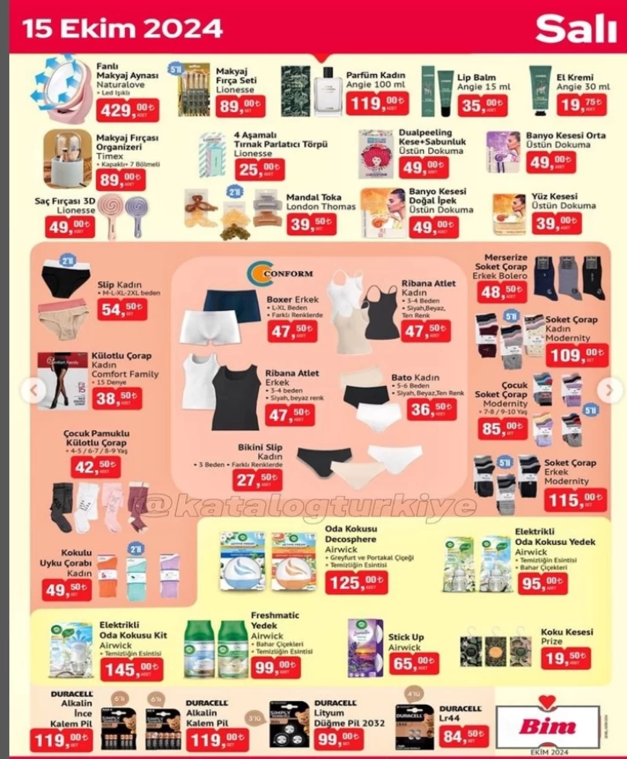 Bim marketlerinin 15 Ekim Salı Aktüel Kataloğunda yine onlarca ürün çok ucuza satışa çıkıyor. Kadın Slip çeşitleri 54,50 TL’den, Kadın kilotlu çorap 38,50 TL’den Ribana Kadın Atlet çeşitleri 47,50 TL’den satışa sunuluyor.