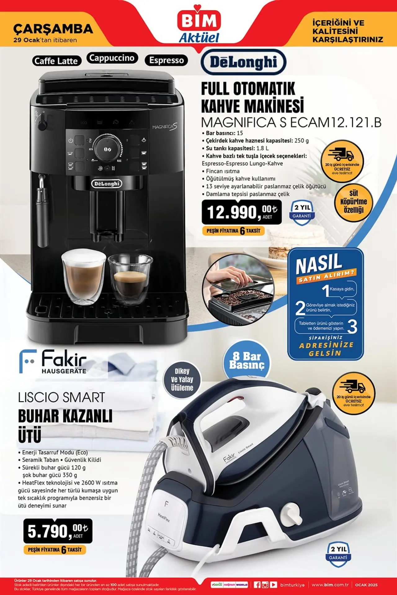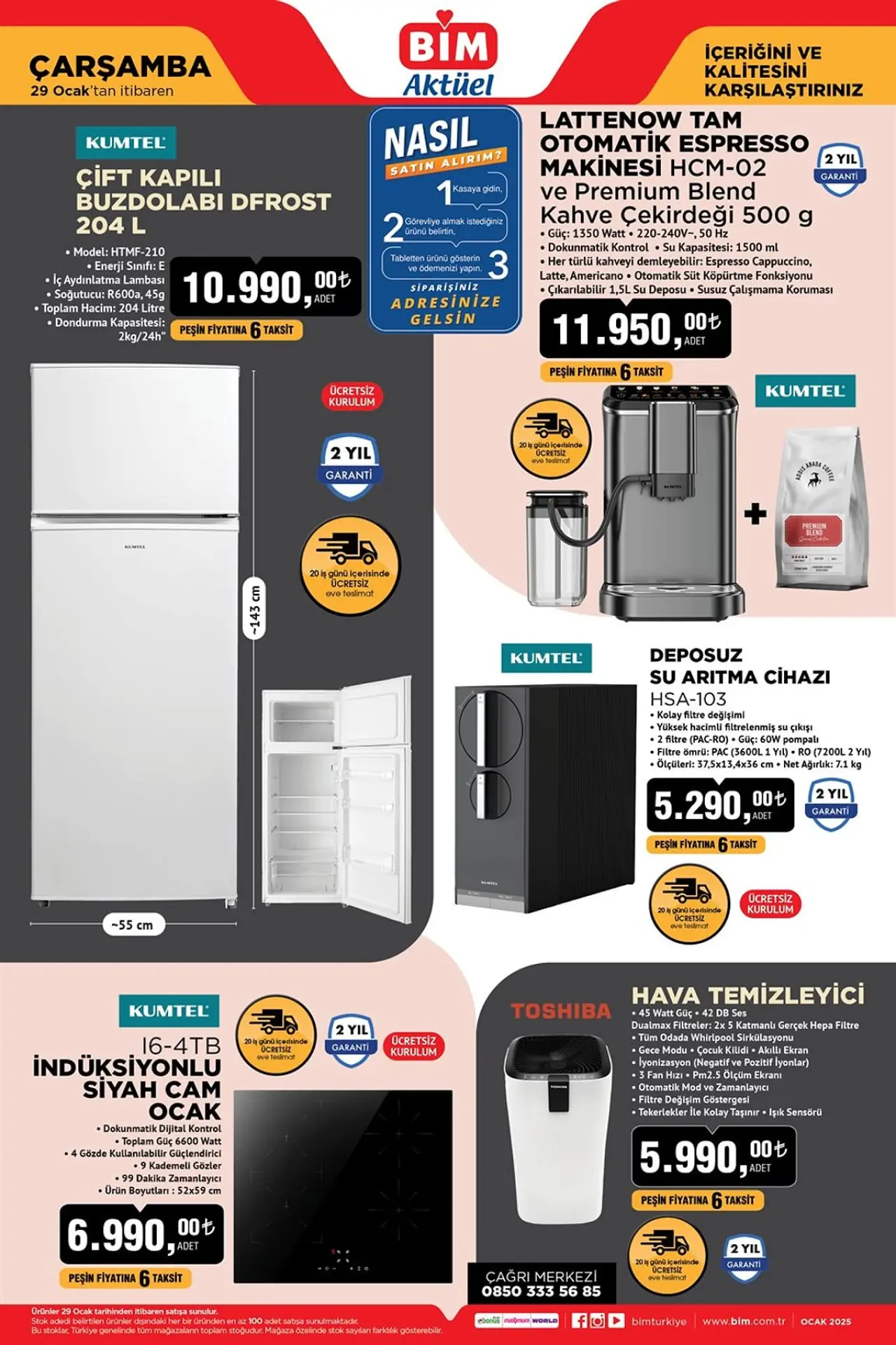 BİM, 25 Ocak 2025 kataloğunda elektronik ürünlere büyük bir yer ayırmış. Kumtel Lattenow Tam Otomatik Espresso Makinesi 11.950 TL, Toshiba Hava Temizleyici 5.990 TL gibi fiyatlarla kullanıcıların beğenisine sunuluyor. Ayrıca, Senna 32" HD Ready Uydu Alıcılı TV 4.390 TL fiyatıyla ev sineması keyfini uygun fiyata yaşamak isteyenler için ideal bir seçenek sunuyor.