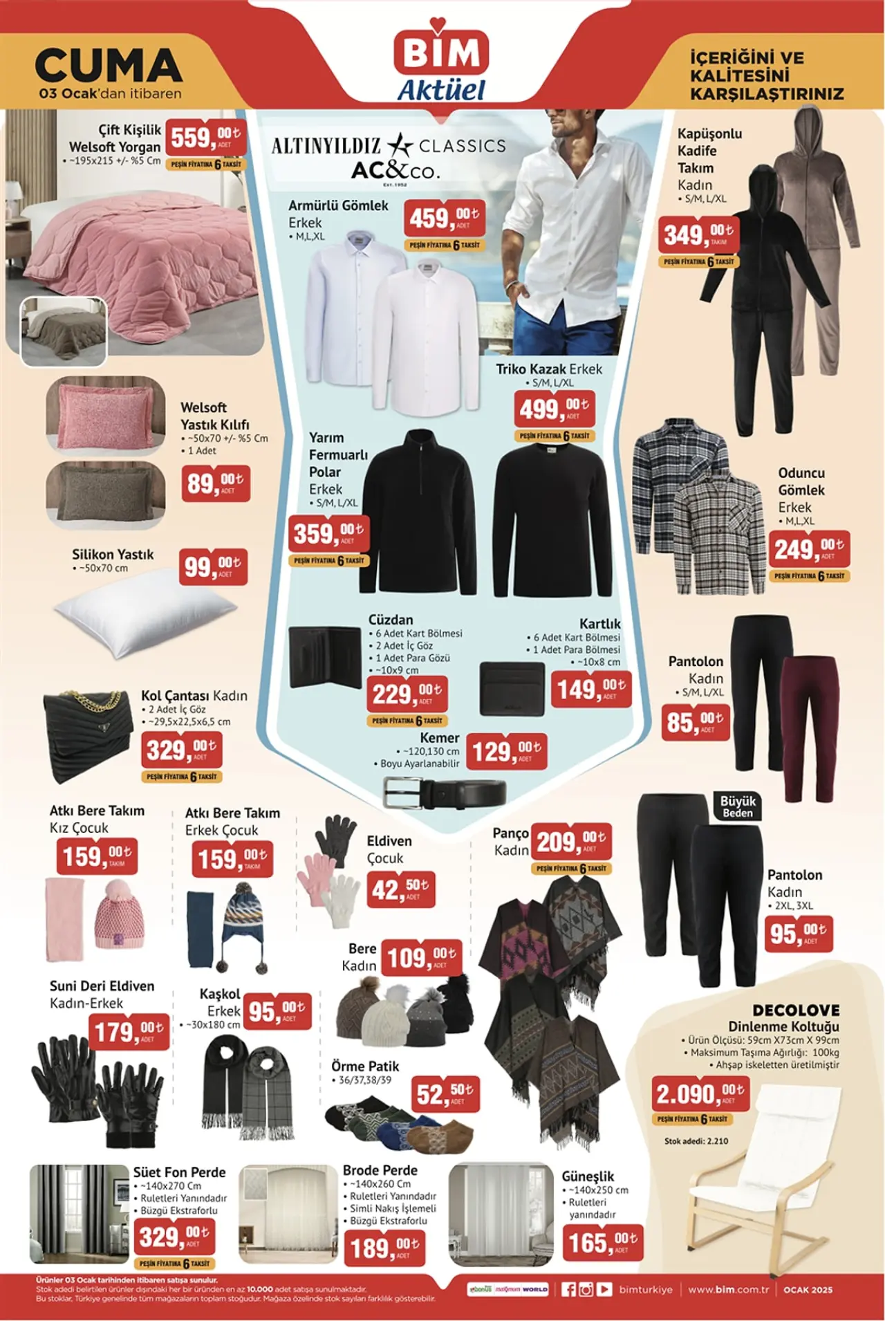 BİM'in 3 Ocak kataloğunda çocuklar için de birçok ürün yer alıyor. Kız/Erkek Çocuk Atkı - Bere Takımı (159 TL) ve Çocuk Eldiveni (42,50 TL) gibi ürünler, soğuk kış günlerinde çocukları sıcak tutacak. Bu ürünler, hem kullanışlı hem de uygun fiyatlı seçenekler sunuyor.