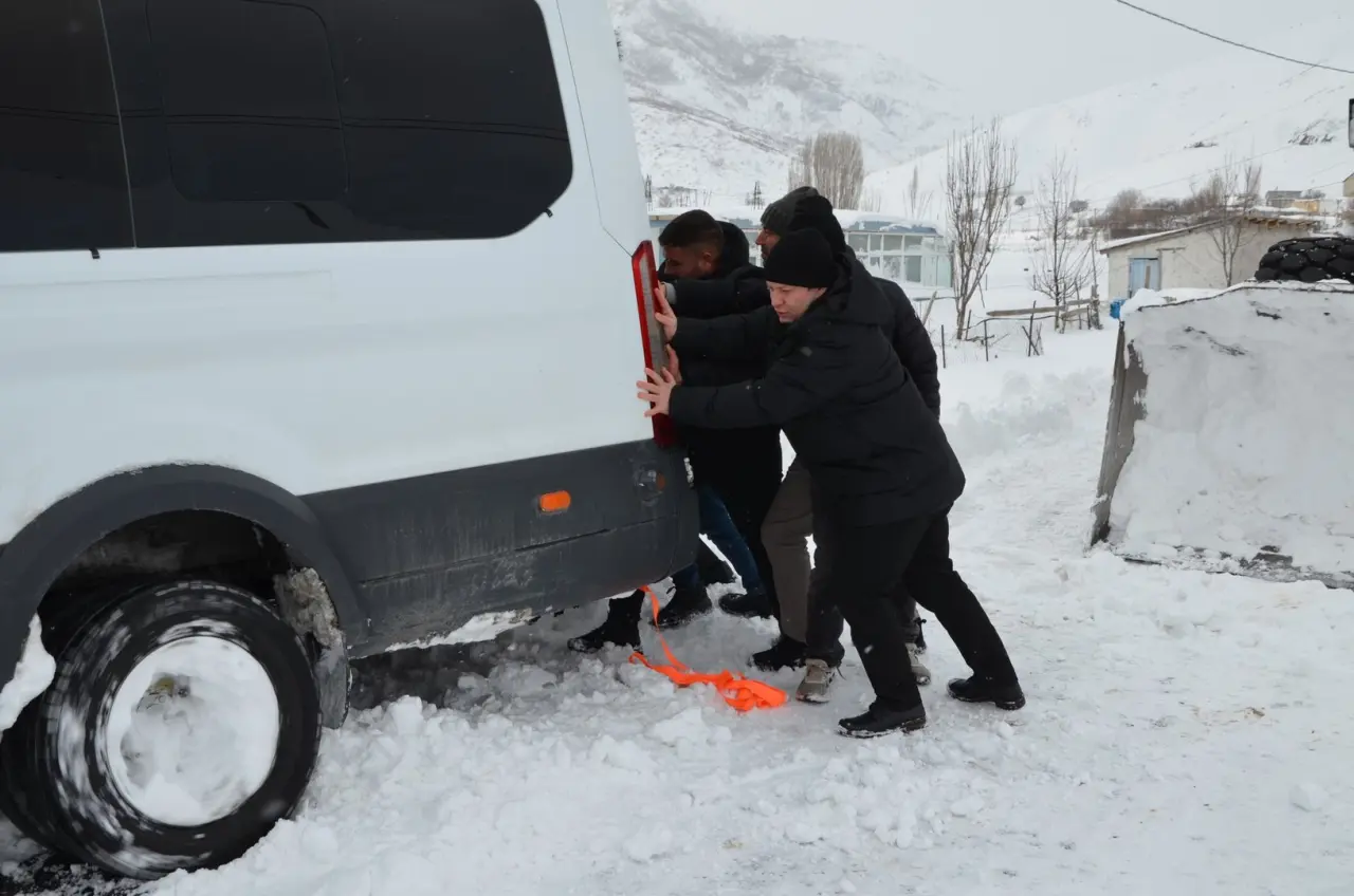 Mahsur kalan araçları iterek ve halatla çekerek güvenliğe ulaştırdı. Ekipler, ilçeye bağlı tüm köylerde karla mücadele çalışmalarını sürdürüyor.
