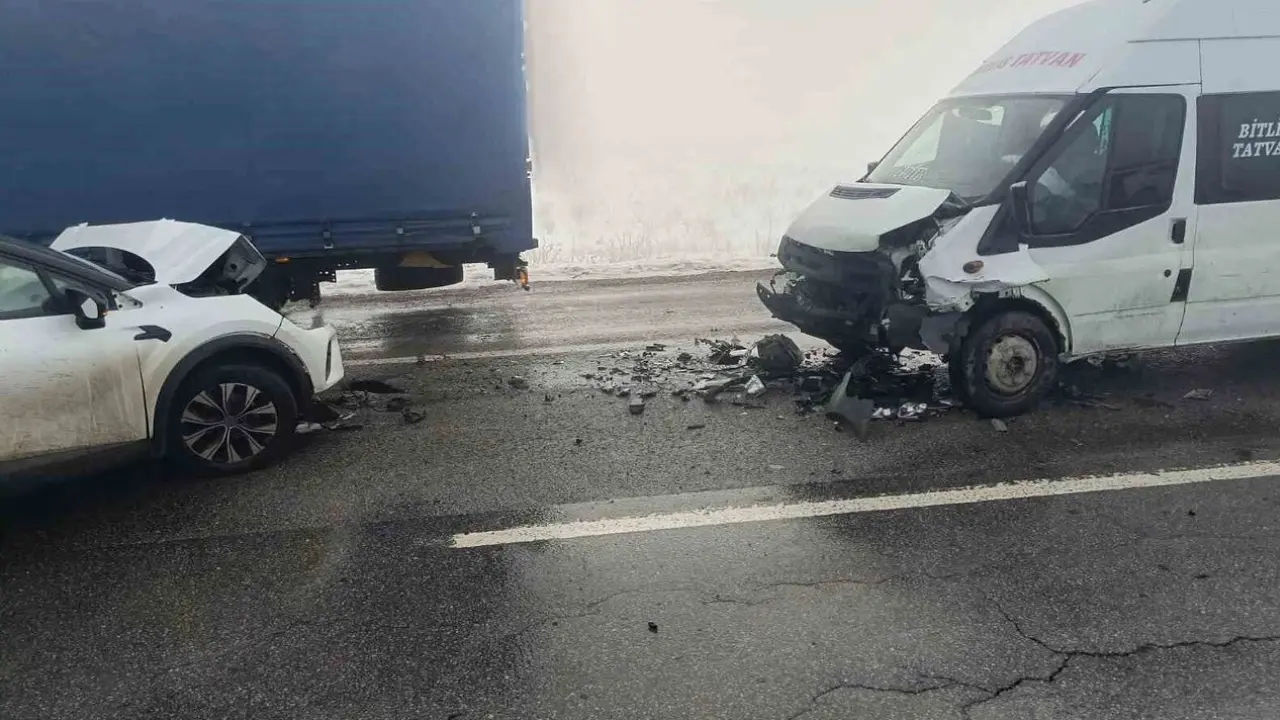 Bitlis-Tatvan karayolunun Rahva Mevkii'nde dün gece başlayan yoğun sis ve buzlanmanın etkisiyle, sabah saatlerinde büyük bir zincirleme trafik kazası meydana geldi. Kazaya, tır, yolcu minibüsü, şehiriçi minibüs ve çok sayıda otomobilin karıştığı öğrenildi. Karayolu üzerindeki koşulların, sürücüler üzerinde olumsuz etkiler yarattığı tahmin ediliyor.