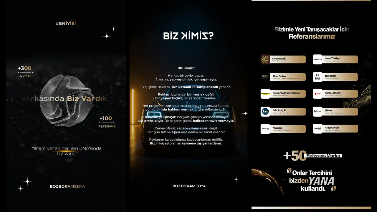 "Sosyal medya yönetimi bizim işimizin kalbi. Markanızı sadece ''var olan'' değil, ''konuşulan'', ''sevilen'' ve ''hatırlanan'' bir yapıya dönüştürüyoruz. İşte bu yüzden müşterilerimiz Bozbora Medya'yı tercih ediyor."