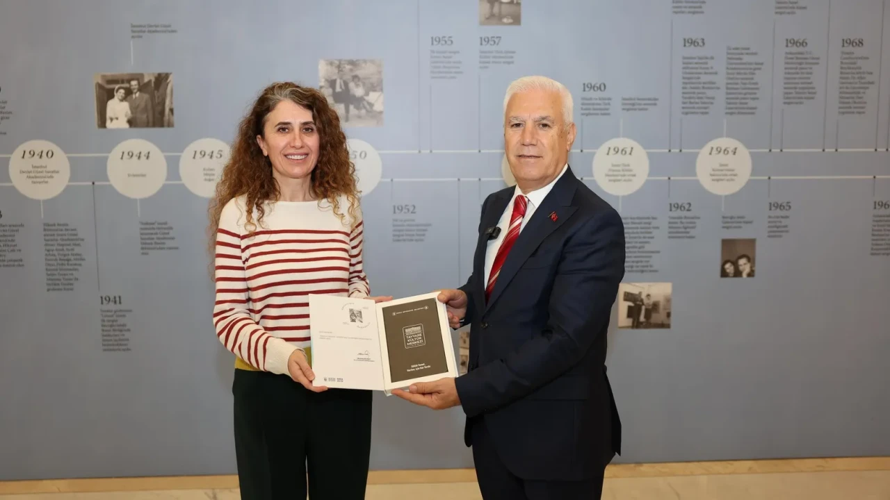 Ziyaretin sonunda Başkan Bozbey, Küratör Yasemin Bay’a sergiye katkıları için teşekkür ederek hediye verdi.