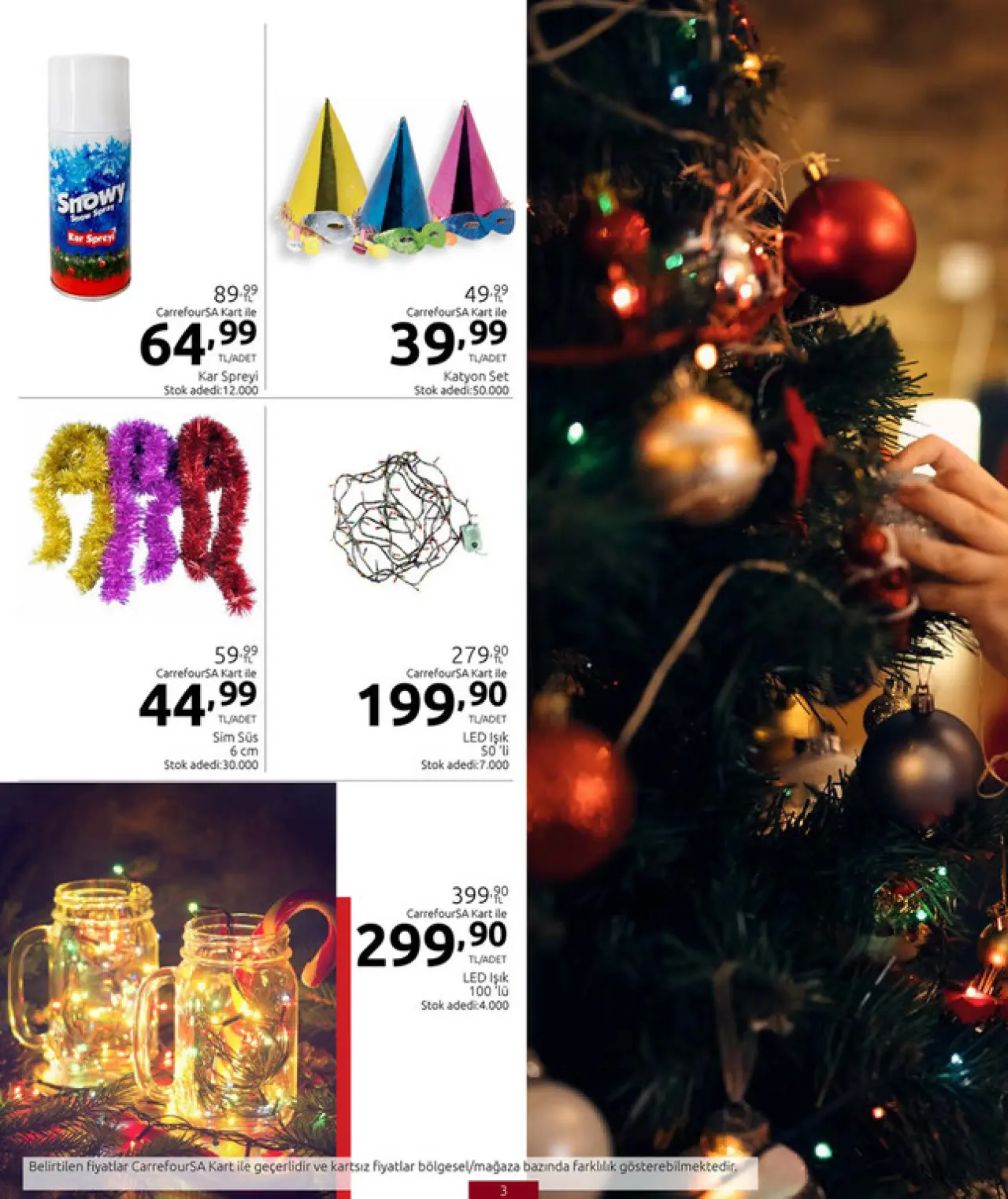 CarrefourSA marketlerinde, yeni yıl ruhunu yansıtan özel ürünler de müşterilerle buluşuyor. Yılbaşı ağacı süslerinden dekoratif kar spreyine kadar birçok ürünü uygun fiyatlarla satın almak mümkün. Ayrıca yılbaşına özel hazırlanan doldurulmuş kızarmış hindi gibi gıda ürünleri de dikkat çekiyor.