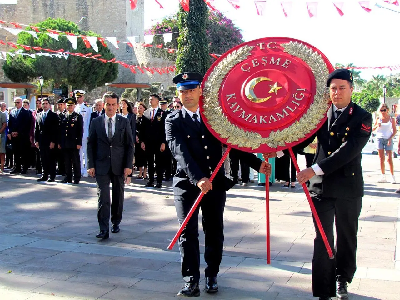 Çeşme'de Gaziler Günü coşkuyla kutlandı, törenlere yoğun katılım oldu. Kaymakam, garnizon komutanı ve belediye başkanı gibi protokol üyeleri törende yer aldı.