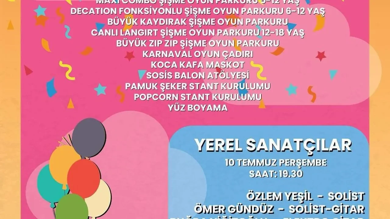 10-11 Temmuz tarihlerinde Amfi Tiyatro Yeşil Alan’da Çocuk Şenliği gerçekleşecek. Etkinlikte şişme parkurlar, yüz boyama ve balon atölyeleri yer alacak.