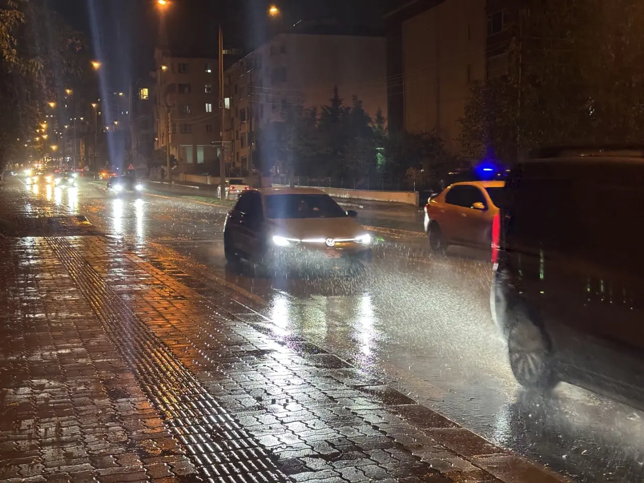 Akşam saatlerinde başlayan yoğun yağmur, cadde ve kaldırımlarda su birikintilerine neden oldu. Vatandaşlar saçak altlarına sığınarak yağmurdan korunmaya çalıştı.